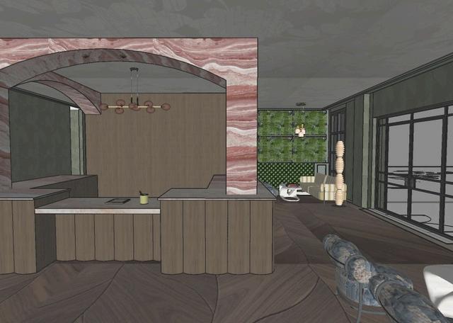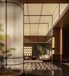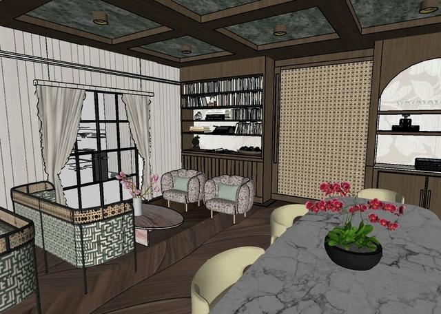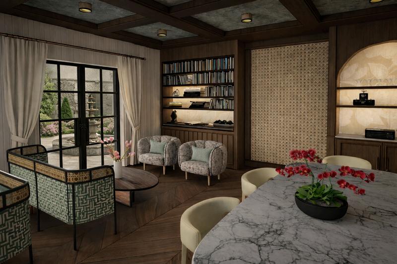 THE PUBLIC/PRIVATE ROOM IS A VERSATILE SPACE DESIGNED FOR A VARIETY OF GATHERINGS, OFFERING BOTH LOUNGE AND MORE FORMAL SEATING. LARGE GLASS DOORS BRING IN NATURAL LIGHT AND CREATE A STRONG CONNECTION TO THE OUTDOORS. THE SPACE FEATURES A DECORATIVE BOOKSHELF, A SMALL BAR, AND A COFFERED CEILING, PAIRED WITH GREEN MARBLE AND FURNITURE PIECES THAT REFERENCE THE COURTYARD GATE DESIGN.