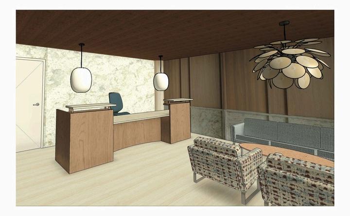 WALKING INTO THE RECEPTION, YOU ARE MET WITH AN ADA FOCUSED DESK THAT ENSURES ACCESSIBILITY FOR ALL USERS. A MARBLE FEATURE WALL CREATES A STRONG FOCAL POINT, COMPLEMENTED BY WOOD ELEMENTS THAT WRAP THE SPACE AND ADD WARMTH. THE USE OF NEXT’S COLOR PALETTE THROUGH MATERIALS AND FINISHES HELPS ESTABLISH A CALM, WELCOMING ATMOSPHERE.