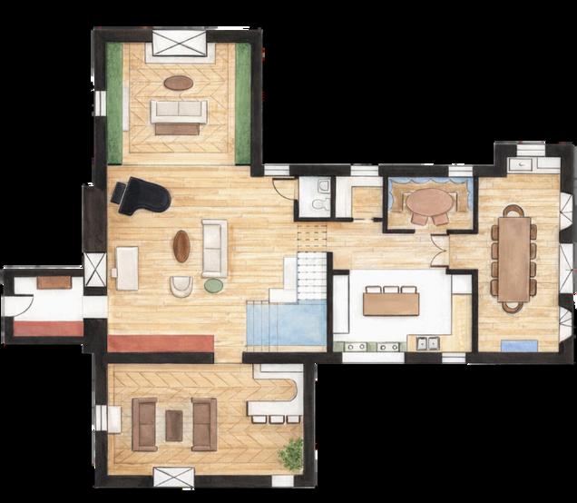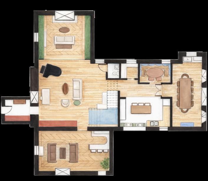 THE FLOOR PLAN WAS DESIGNED TO BALANCE OPENNESS AND PRIVACY, BEGINNING WITH A LARGE PUBLIC LIVING SPACE AND GRADUALLY TRANSITIONING INTO MORE INTIMATE AREAS FOR THE FAMILY AS ONE MOVES DEEPER INTO THE HOME, THE SPACES BECOME INCREASINGLY PERSONAL VARIATIONS IN FLOORING WERE USED TO SUBTLY DEFINE BOUNDARIES, CREATING A LAYERED SENSE OF SEPARATION WITHOUT THE NEED FOR PHYSICAL BARRIERS