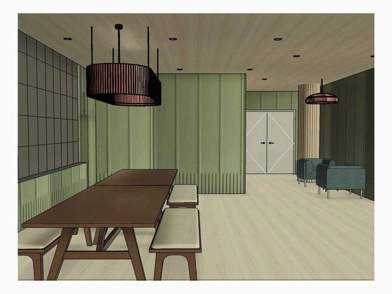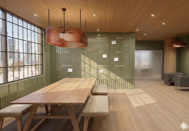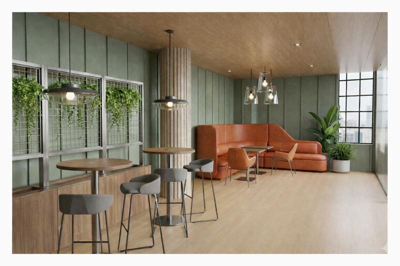 THE PARLOR IS A SPACE DESIGNED TO CONNECT WITH NEARBY SEATING AND SOCIAL AREAS, OFFERING A PLACE TO RELAX OUTSIDE OF THE TRADITIONAL WORKSPACE. IT ENCOURAGES PEOPLE TO COME TOGETHER AND, THROUGH ITS CONNECTION TO THE CAFÉ, CREATES A LARGER HUB FOR COLLABORATION AND INTERACTION. PLAYFULNESS IS INTRODUCED THROUGH A LARGE WALL-MOUNTED CALENDAR, ALONG WITH BIOPHILIC ELEMENTS THAT BRING IN A CONNECTION TO NATURE.
