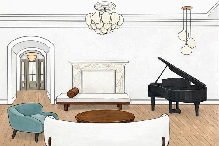 THE LIVING ROOM IS A BIG OPEN SPACE IN THE CENTER OF THE HOME INTEGRATED SOCIAL INTEGRATION THROUGH THE PIANO THE FAMILY HAS BROUGHT WITH THEM FOR THE HOME. PRESERVING THE ORIGINAL LIMESOTNE FIREPLACE THAT PLAYS A BIG PART AS ONE OF THE HOME ORIGIANL ELEMENTS. INCORPERATING DELICATE LIGHTING THAT COMPLIMENTS TO DETYAILED MOLDING.