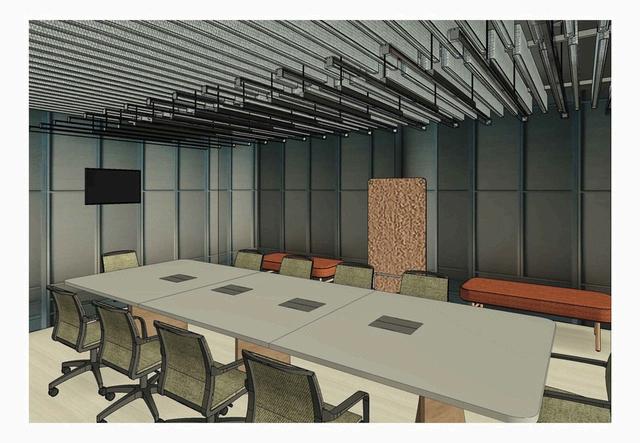 THIS SPACE IS DESIGNED TO SUPPORT LARGER GROUPS COMING TOGETHER. IN ADDITION TO SEATING AT THE MAIN CONFERENCE TABLE, THERE ARE EXTRA SEATING OPTIONS THROUGHOUT THE ROOM. THE LAYOUT ALLOWS FOR COMFORTABLE, ACCESSIBLE CIRCULATION AND CLEAR VIEWING ANGLES TO THE TELEVISION, WHILE ACOUSTICS ARE PRIORITIZED THROUGH THE CEILING DESIGN.
