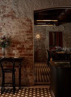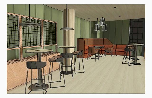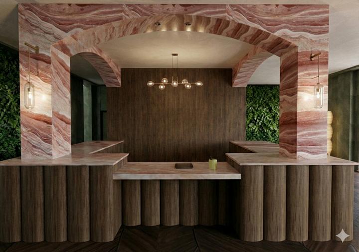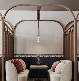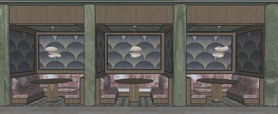 TTHE LOBBY BAR SERVES AS A SOCIAL HUB FOR THE HOTEL, ACCOMMODATING BOTH INTIMATE MOMENTS AND FAMILY GATHERINGS. IT INCORPORATES CIRCULATION PATHS THAT ALIGN WITH THE OVERALL CONCEPT, WHILE BOOTH DIVIDERS INSPIRED BY IRON GATES PROVIDE A SENSE OF PRIVACY. THE SPACE INTEGRATES PLAYFUL PATTERNS THROUGH FURNITURE, WALLPAPER, AND FLOOR TRANSITIONS, REINFORCING MOVEMENT AND CONNECTION THROUGHOUT THE DESIGN.