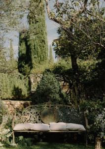 COURTYARD GARDEN WITH HERBS AND FLOWERS.