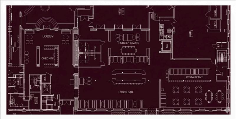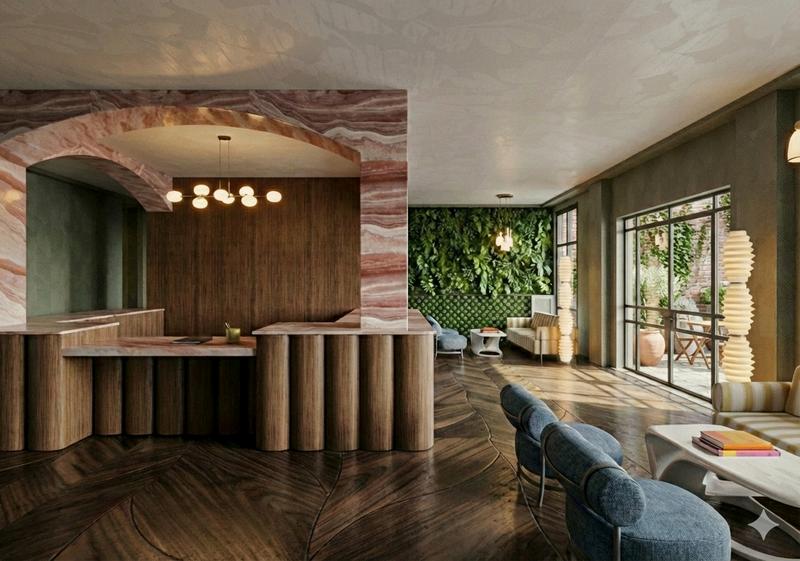 THE LOBBY CREATES THE FIRST IMPRESSION OF THE SPACE, FEATURING FLORAL PATTERNED WOOD FLOORING AND AN ADA FOCUSED CHECK-IN COUNTER. BIOPHILIC ELEMENTS ARE INCORPORATED THROUGH PLANT INSTALLATIONS AND FLORAL WALLPAPER ON THE CEILING, ESTABLISHING A WELCOMING AND NATURE-INSPIRED ENVIRONMENT THAT HELP STRENGTHEN THE CONNECTION WITH THE CONCEPT.