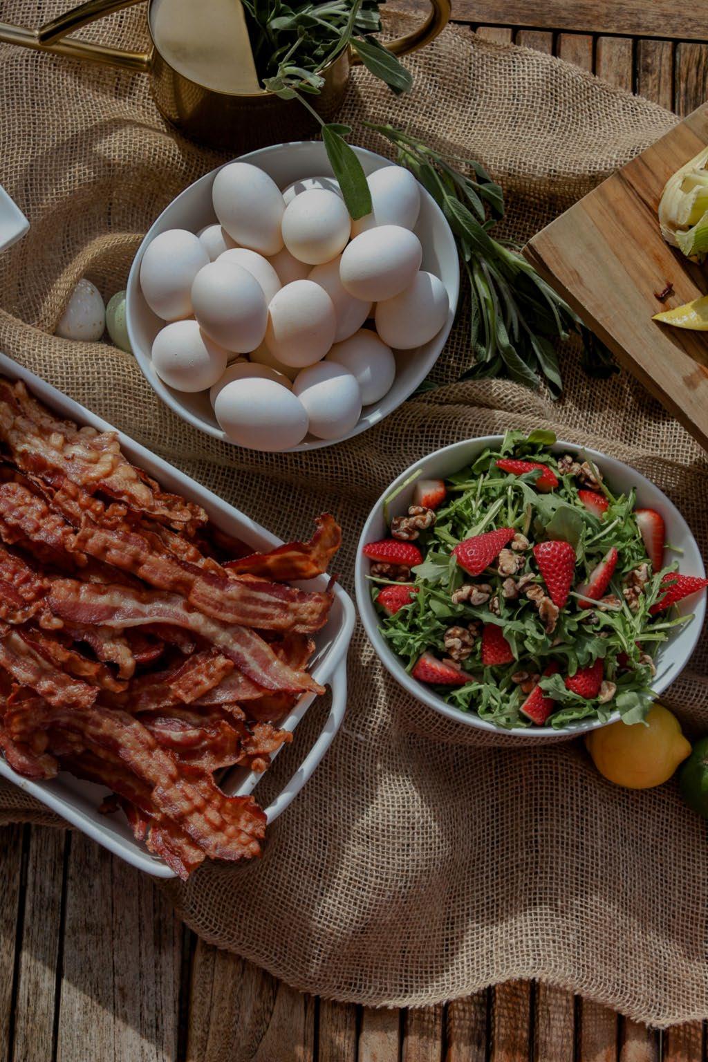 French toast with maple syrup, butter, and Huntington marmalade; applewood-smoked bacon, farmers market vegetable and aged cheddar frittata; and sliced seasonal fruit