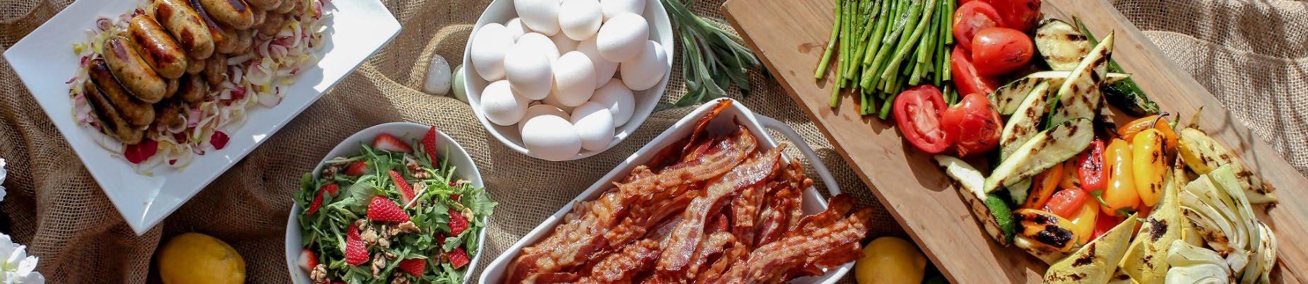 Fluffy scrambled eggs, choice of applewood-smoked bacon or chicken-apple sausage, breakfast potatoes with peppers and onions, biscuits with butter, and seasonal fruit platter