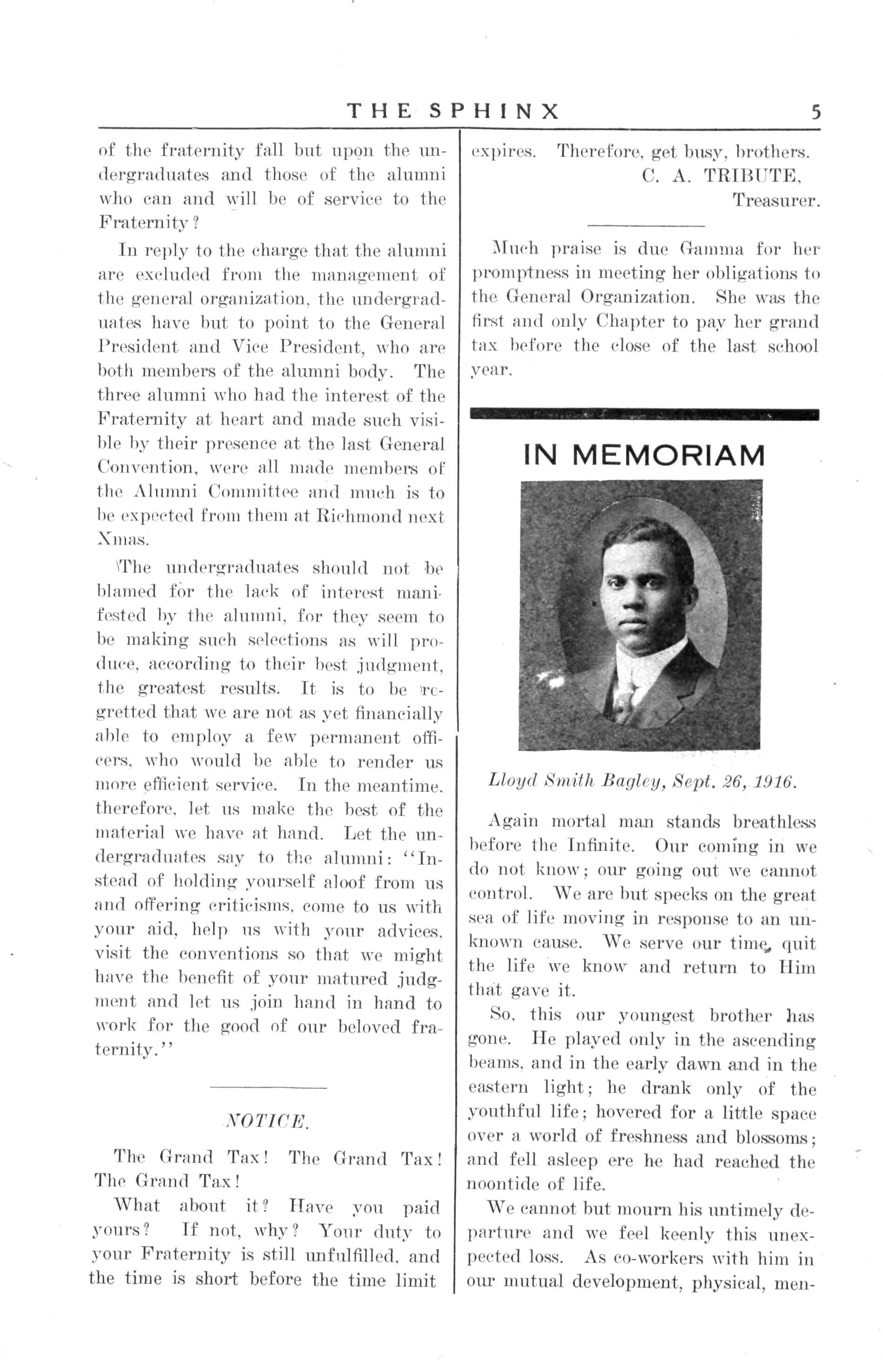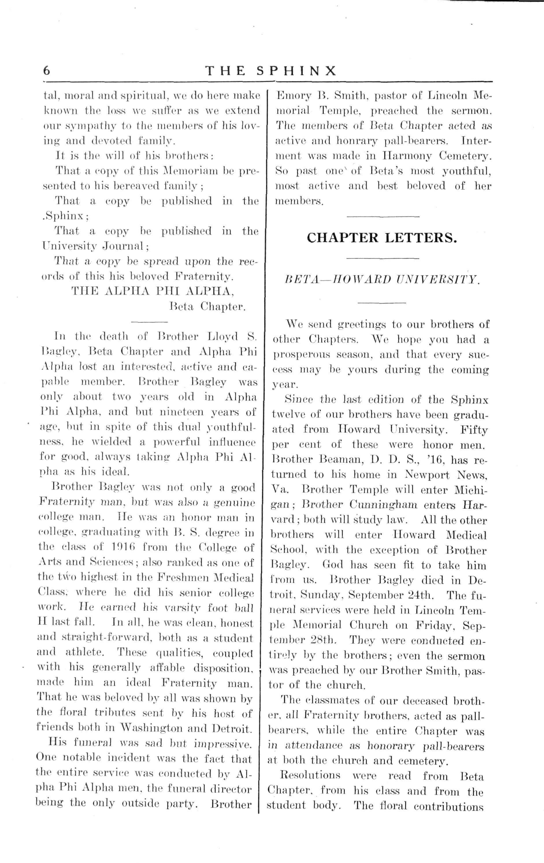 In tin- death of Brother Lloyd S. Bagley, Beta Chapter and Alpha Phi Alpha lost an interested, active and capable member. Brother Bagley was only about two years old in Alpha Phi Alpha, and hut nineteen years of age, but in spite of this dual youthfulness. he wielded a powerful influence for good, always taking Alpha Phi Alpha as his ideal