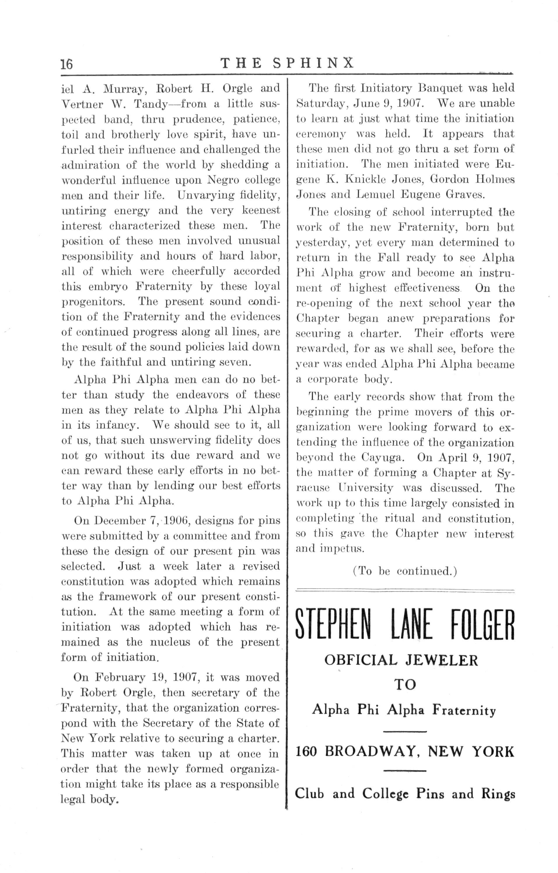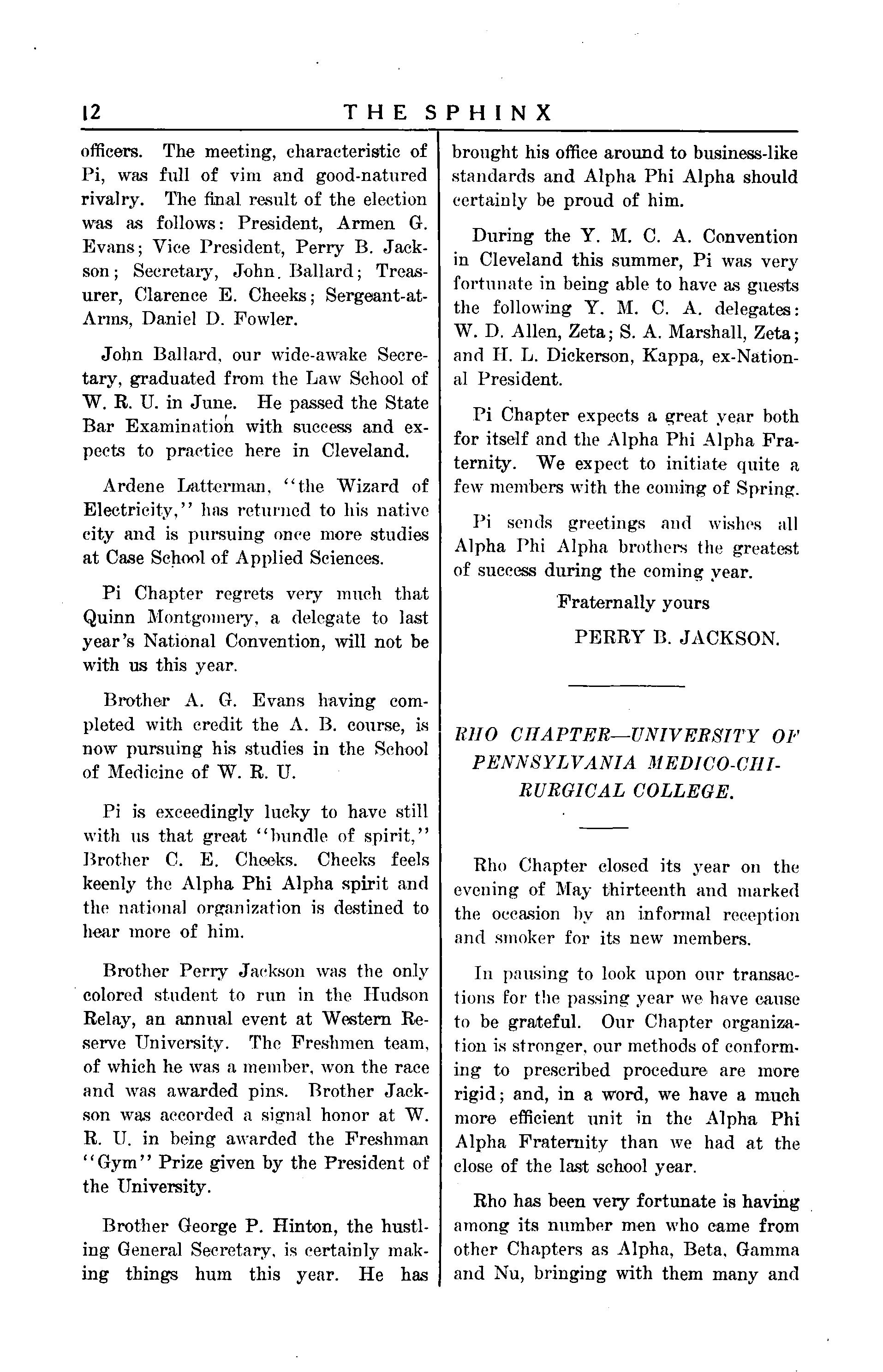 In pausing to look upon our transactions for the passing year we have cause to be grateful Our Chapter organization is stronger, our methods of conforming to prescribed procedure are more rigid; and, in a word, we have a much more efficient unit in the Alpha Phi Alpha Fraternity than we had at the close of the last school year