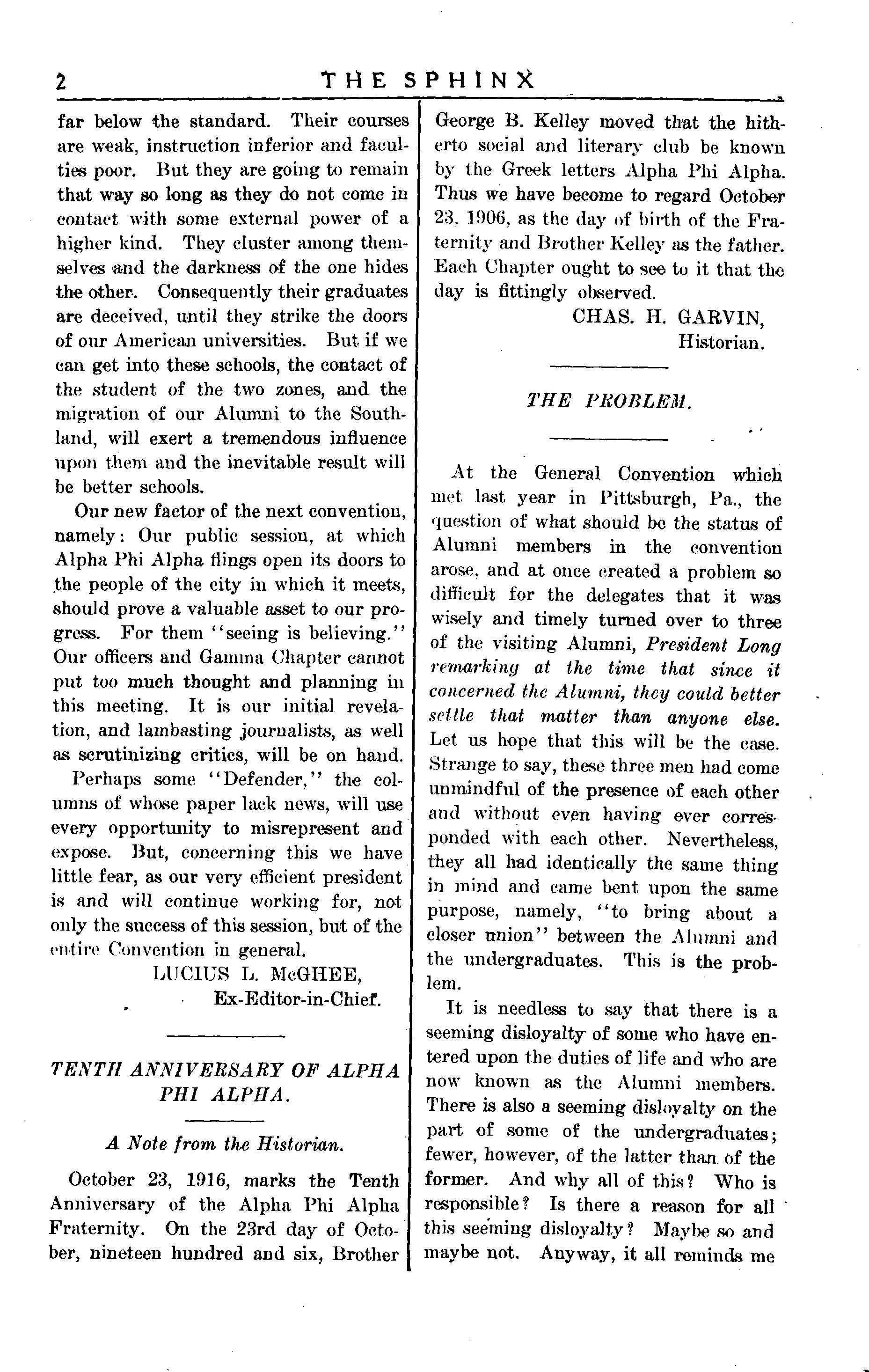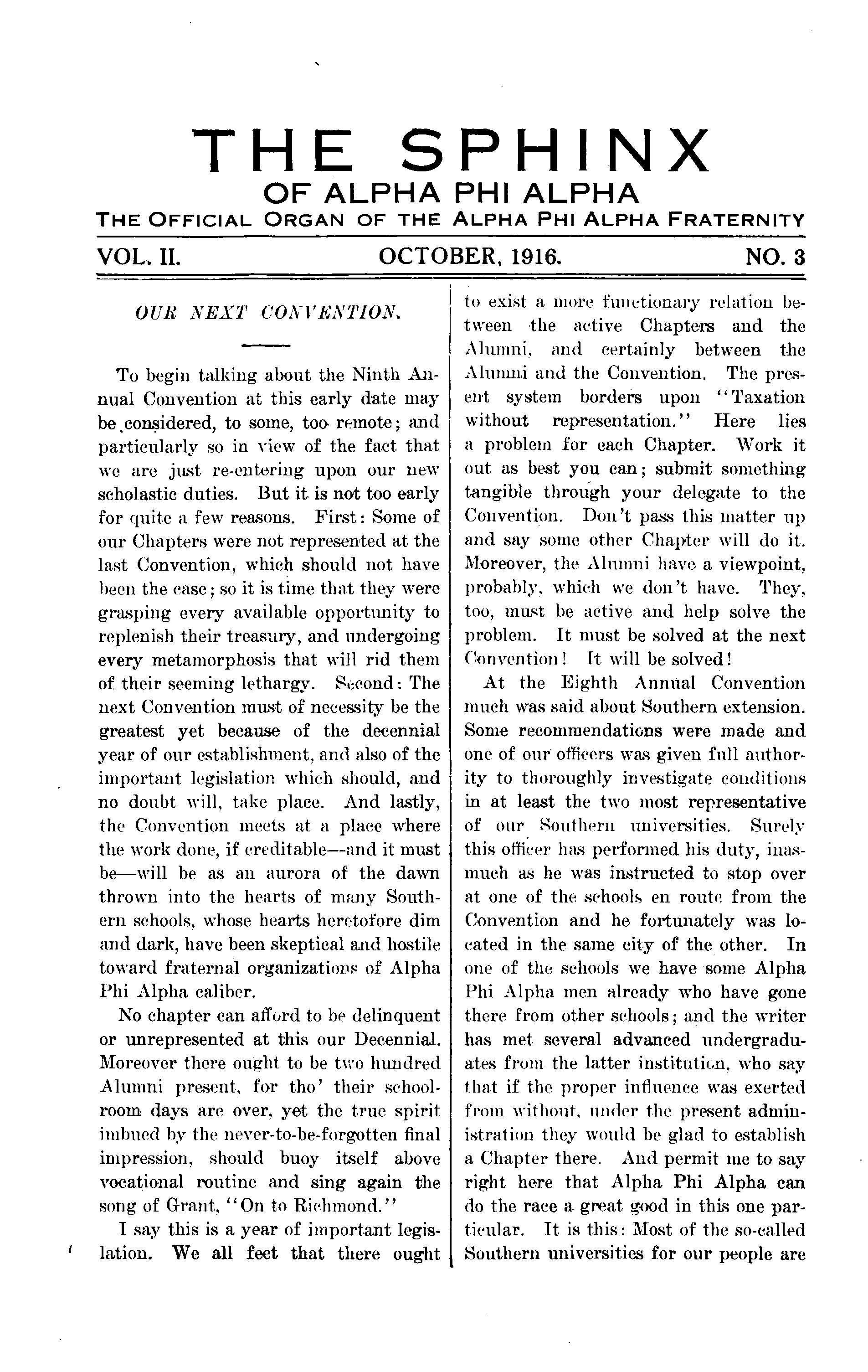 Second: The next Convention must of necessity be the greatest yet because of the decennial year of our establishment, and also of the important legislation which should, and no doubt will, take place. And lastly, the Convention meets at a place where the work done, if creditable—and it must be—will be as an aurora of the dawn thrown into the hearts of many Southern schools, whose hearts heretofore dim and dark, have been skeptical and hostile toward fraternal organization? of Alpha Phi Alpha caliber