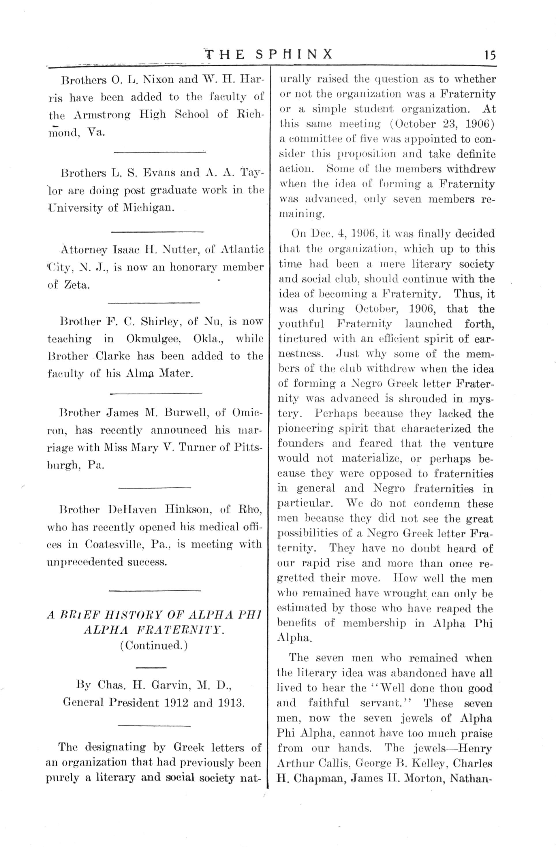 The seven men who remained when the literary idea was abandoned have all lived to hear the "Well done thou good and faithful servant." These seven men, now the seven jewels of Alpha Phi Alpha, cannot have too much praise from our hands The jewels—Henry Arthur Callis, George B. Kelley, Charles H. Chapman, James II. Morton, Nathan-