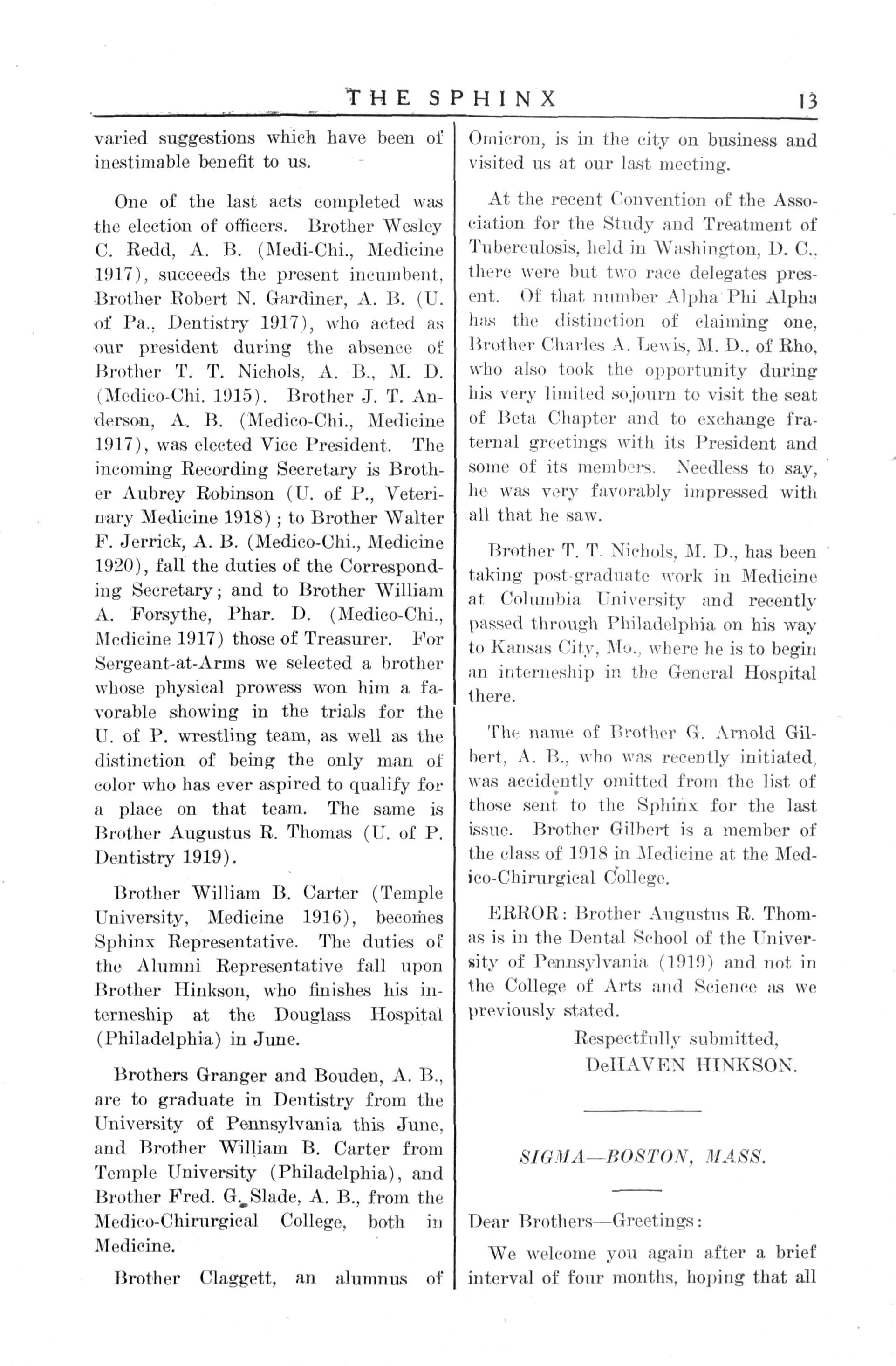 Brother William B Carter (Temple University, Medicine 1916), becomes Sphinx Representative. The duties of the Alumni Representative fall upon Brother Ilinkson, who finishes his inteirneship at the Douglass Hospital (Philadelphia) in June.
