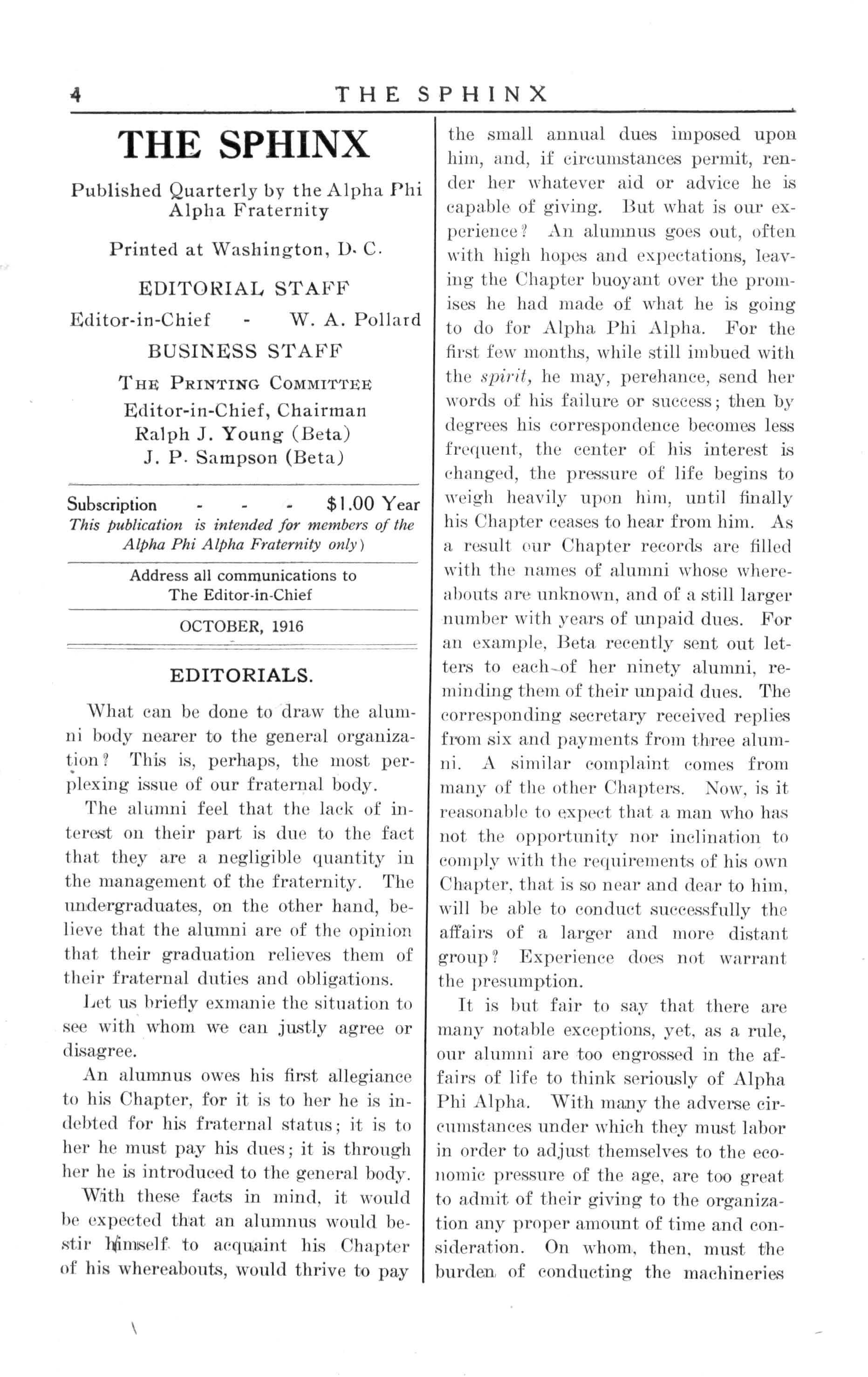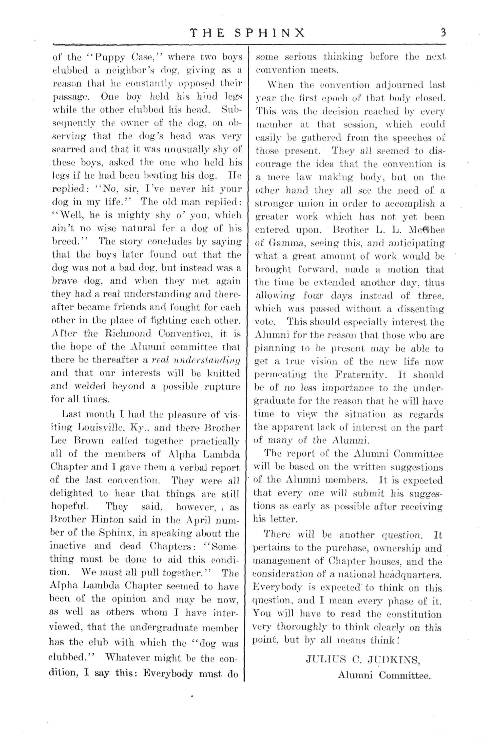 Last month I had the pleasure of visiting Louisville Ky., and there Brother Lee Brown called together practically all of the members of Alpha Lambda Chapter and I gave them a verbal report of the last convention. They were all delighted to hear that things are still hopeful They said, however, i as Brother Hinton said in the April number of the Sphinx, in speaking about the inactive and dead Chapters: "Something must be done to aid this condition We must all pull together." The Alpha Lambda Chapter seemed to have been of the opinion and may be now, as well as others whom I have interviewed, that the undergraduate member has the club with which the "dog was clubbed." Whatever might be the condition, I say this: Everybody must do