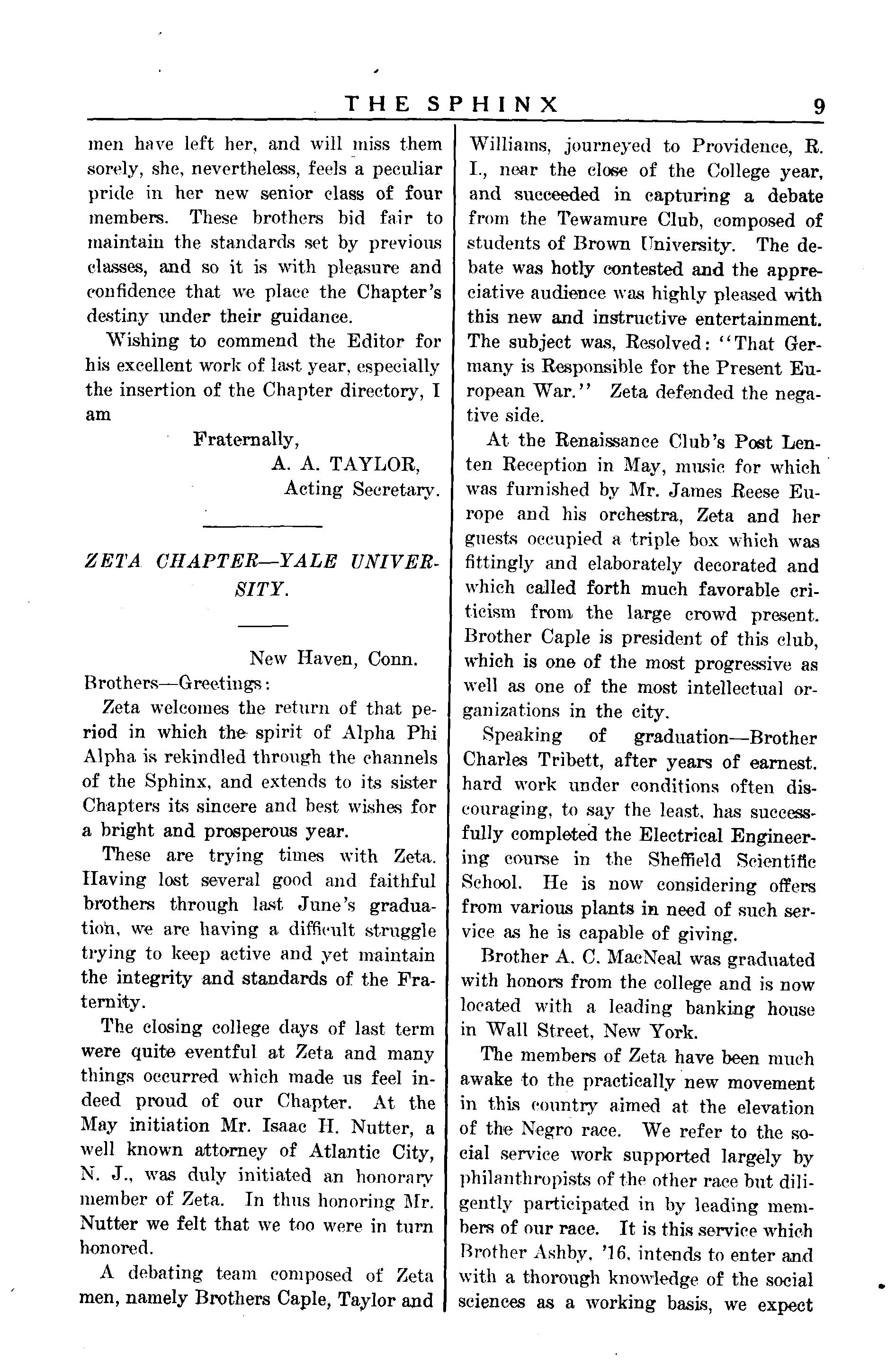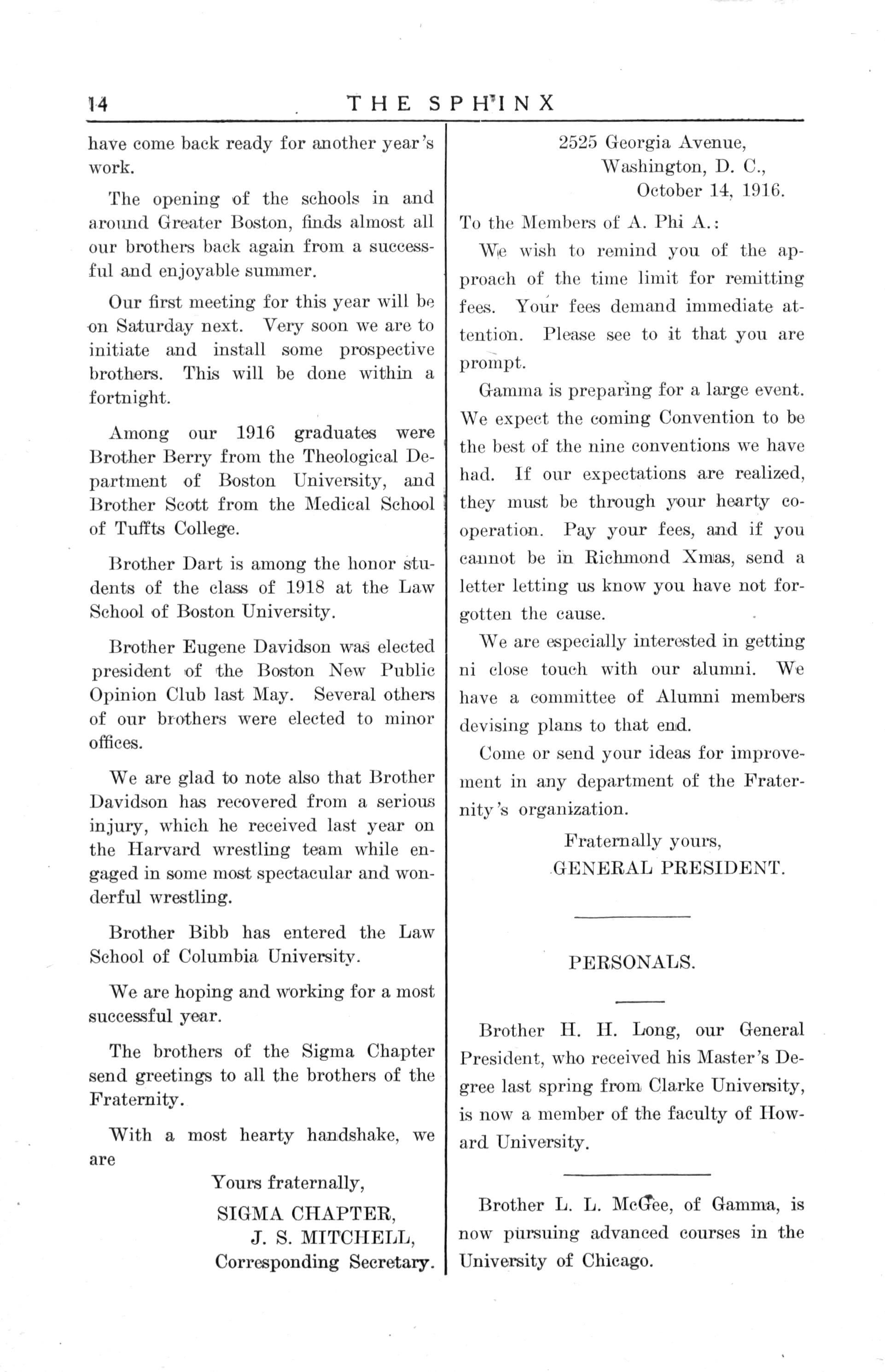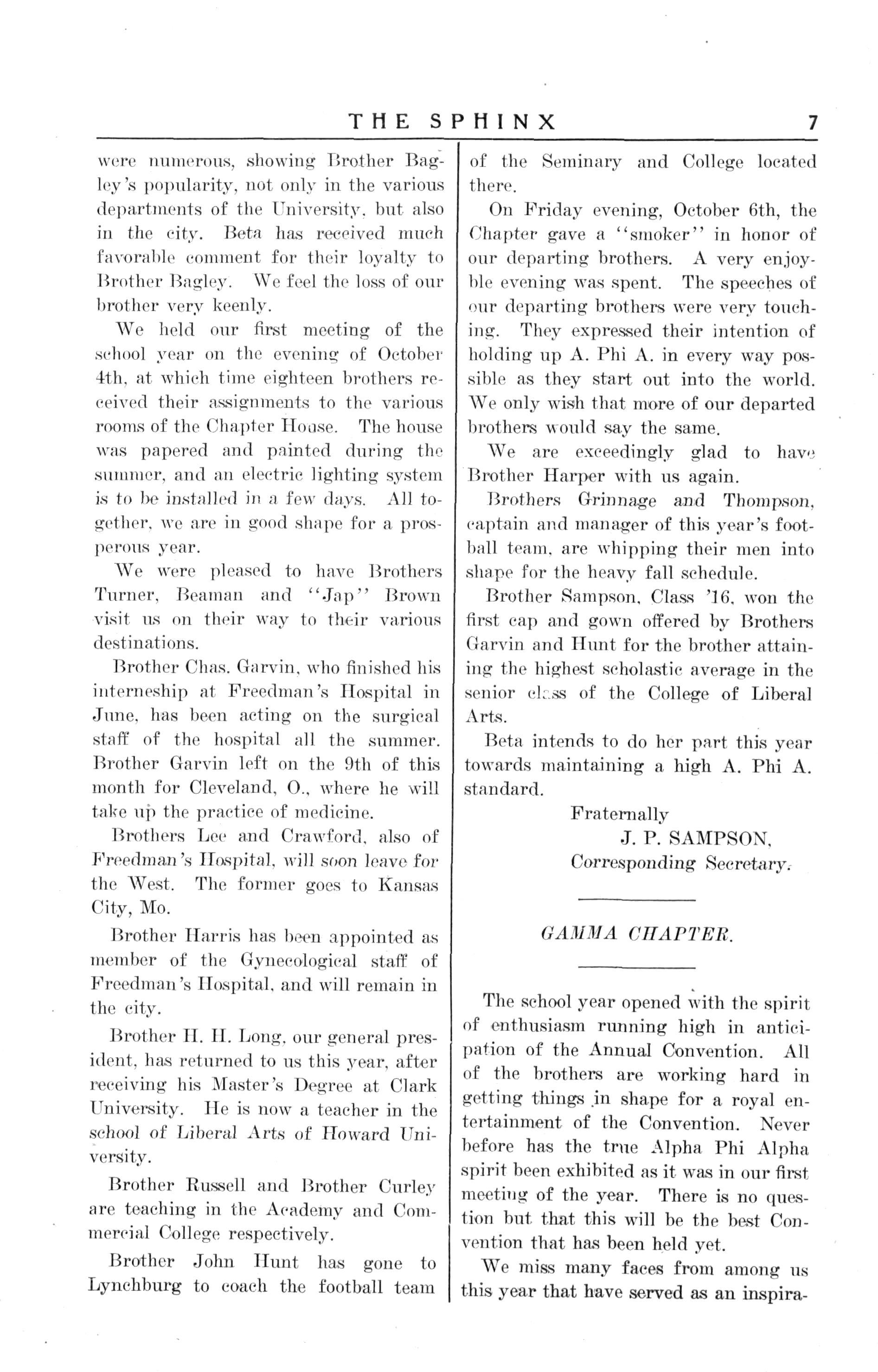 Since the last edition of the Sphinx twelve of our brothers have been graduated from Howard I'niversity Fifty per cent of these were honor men. Brother Beaman, D D S., '16, has returned to his home in Newport News, Va. Brother Temple will enter Michigan ; Brother Cunningham enters Harvard; both will study law. All the other brothers will enter Howard Medical School, with the exception of Brother Bagley, God has seen fit to take him from us Brother Bagley died in Detroit. Sunday. September 24th. The funeral services were held in Lincoln Temple Memorial Church on Friday. September 28th They were conducted entirely by the brothers; even the sermon was preached by our Brother Smith, pastor of the church