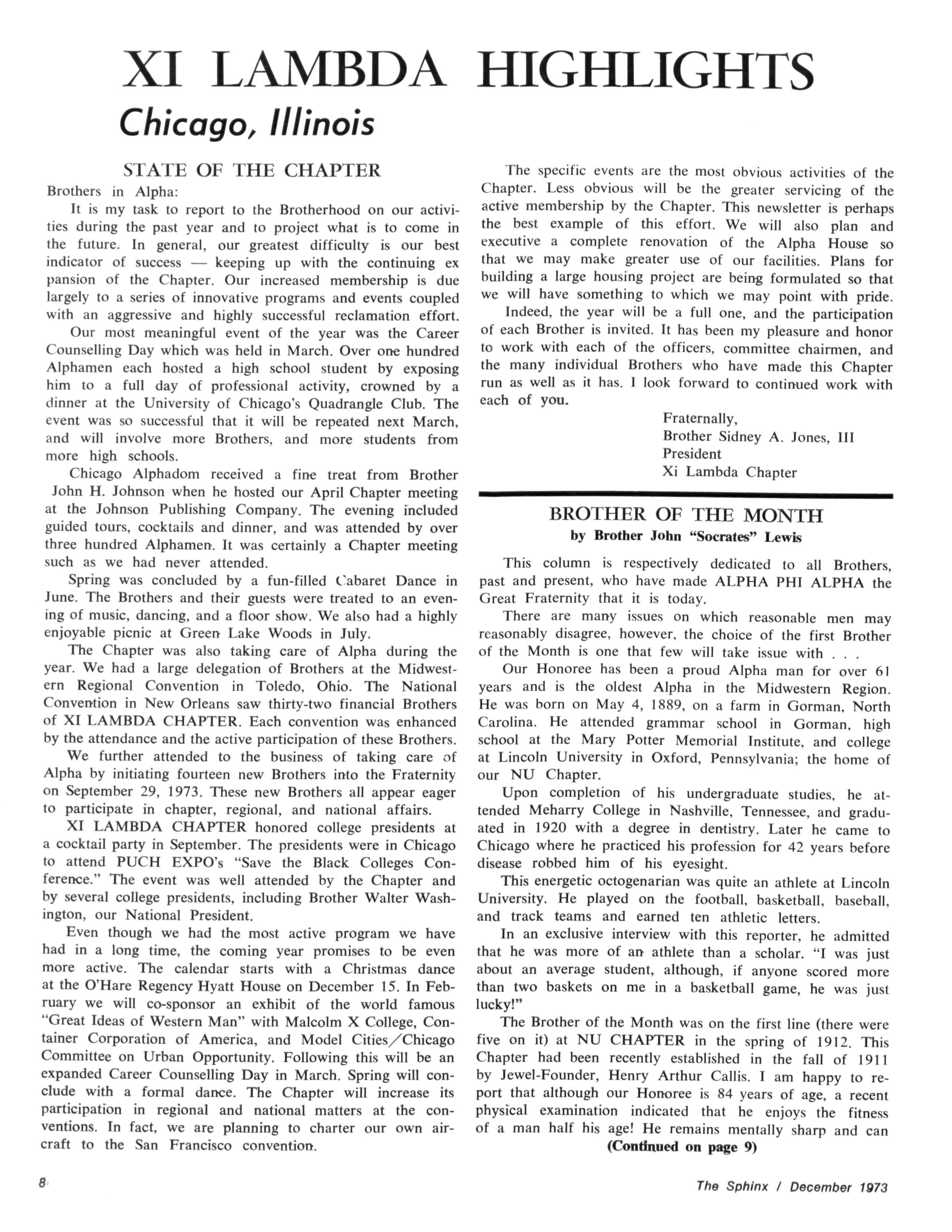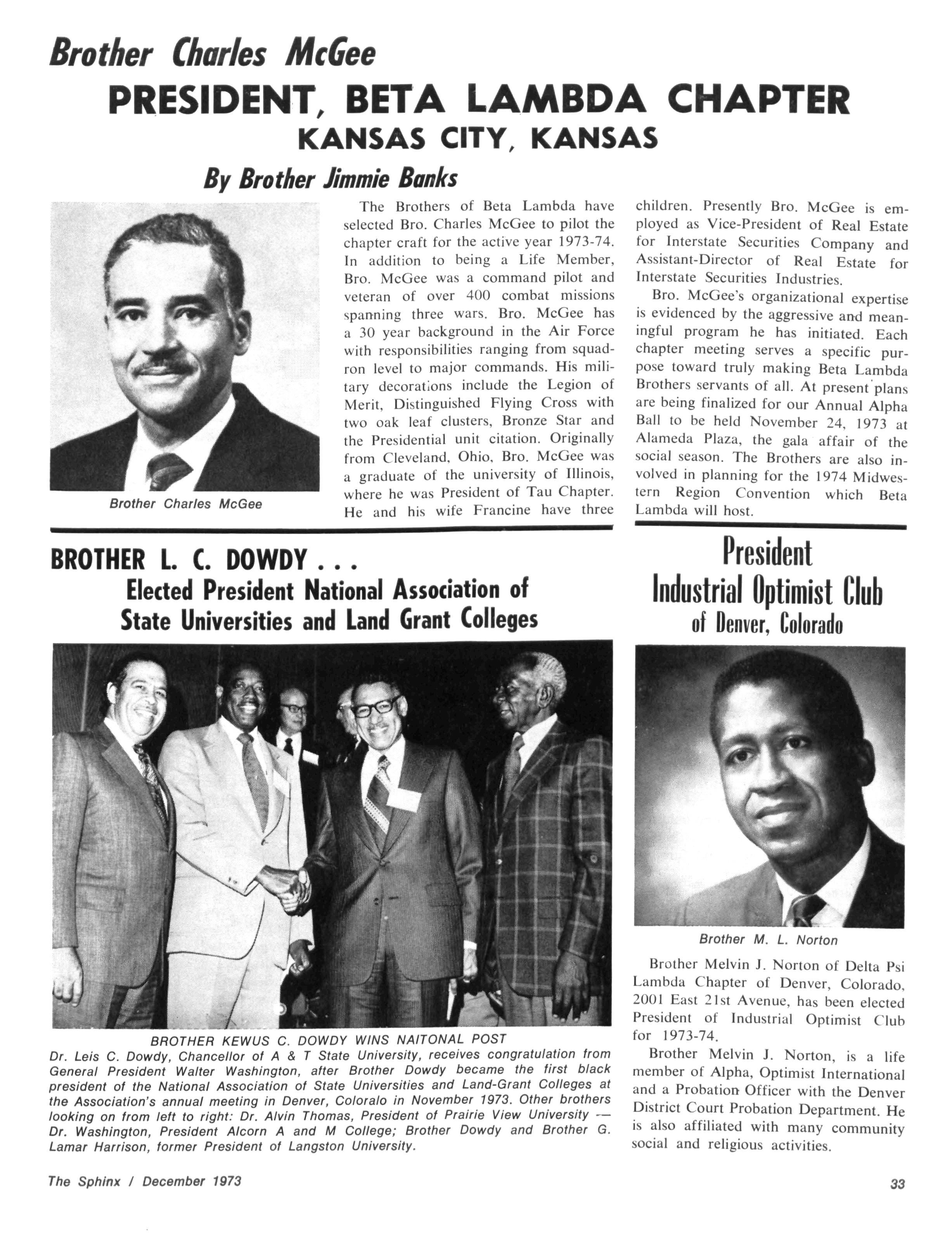 Bro McGee's organizational expertise is evidenced by the aggressive and meaningful program he has initiated Each chapter meeting serves a specific purpose toward truly making Beta Lambda Brothers servants of all At present'plans are being finalized for our Annual Alpha Ball to be held November 24, 1973 at Alameda Plaza, the gala affair of the social season. The Brothers are also involved in planning for the 1974 Midwestern Region Convention which Beta Lambda will host.