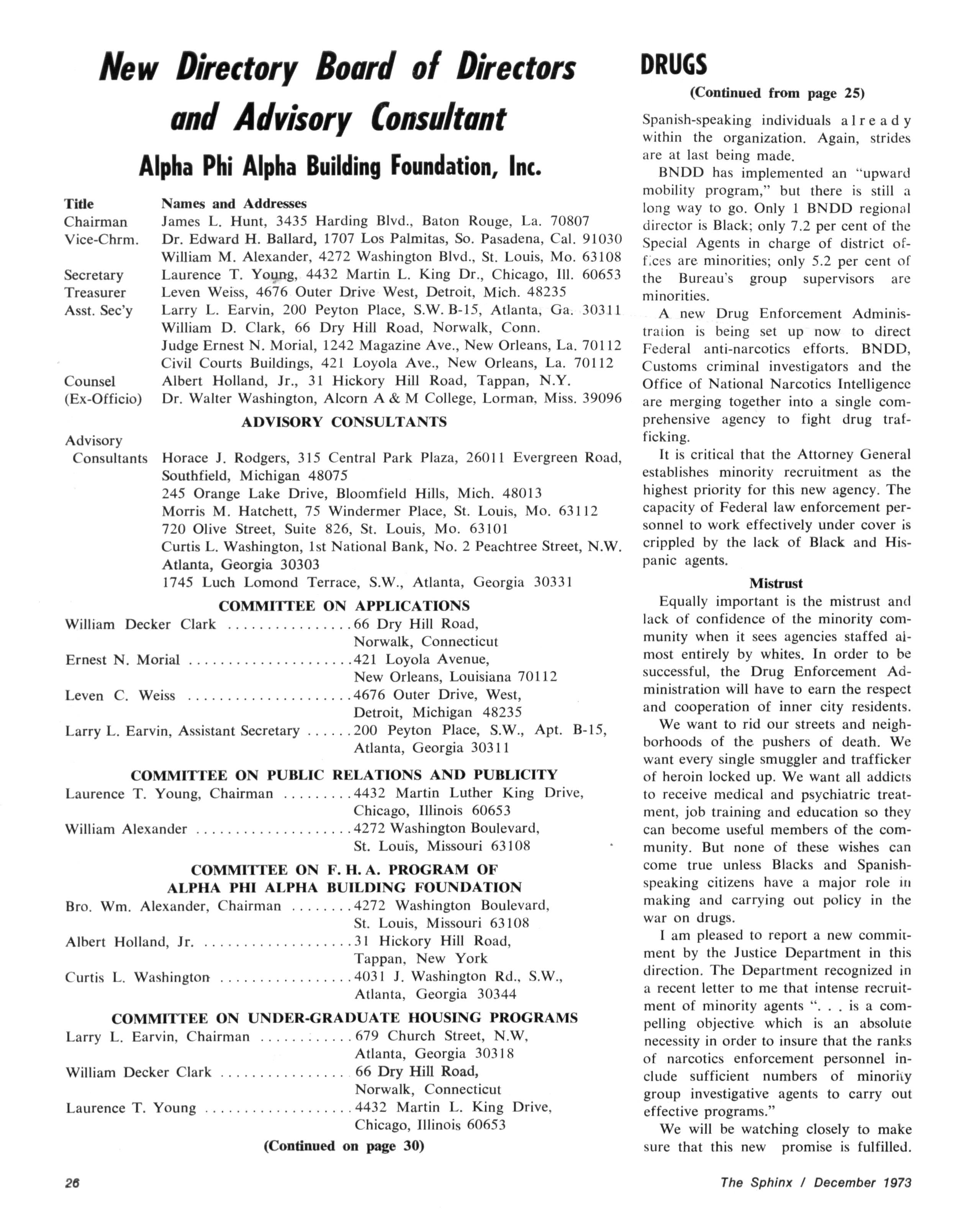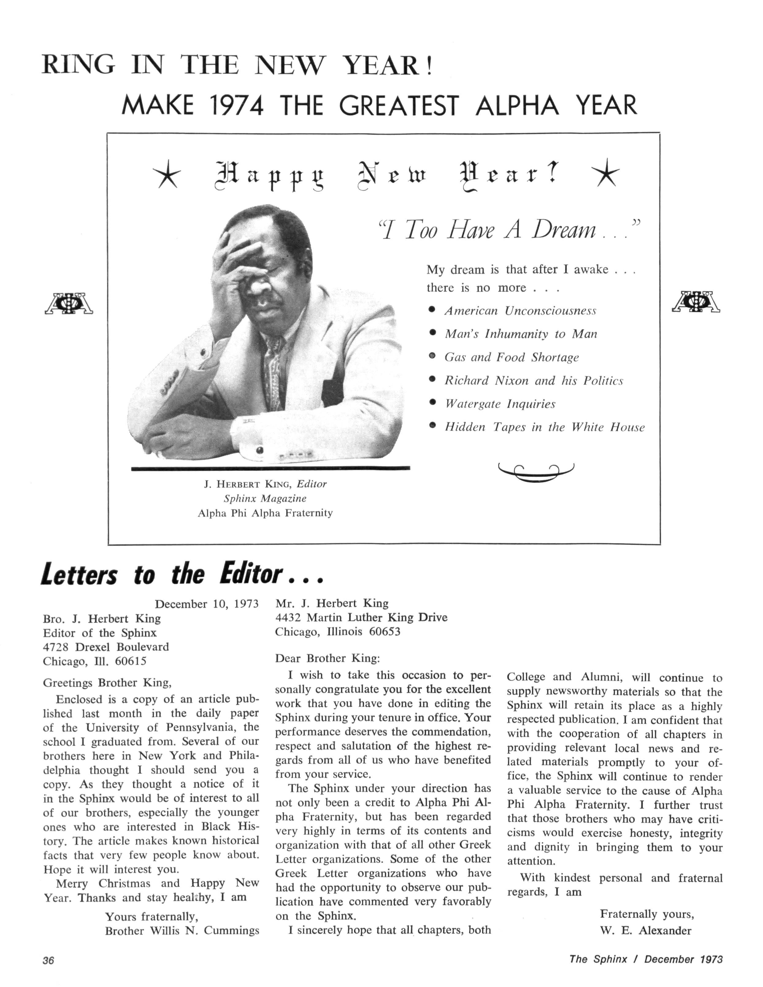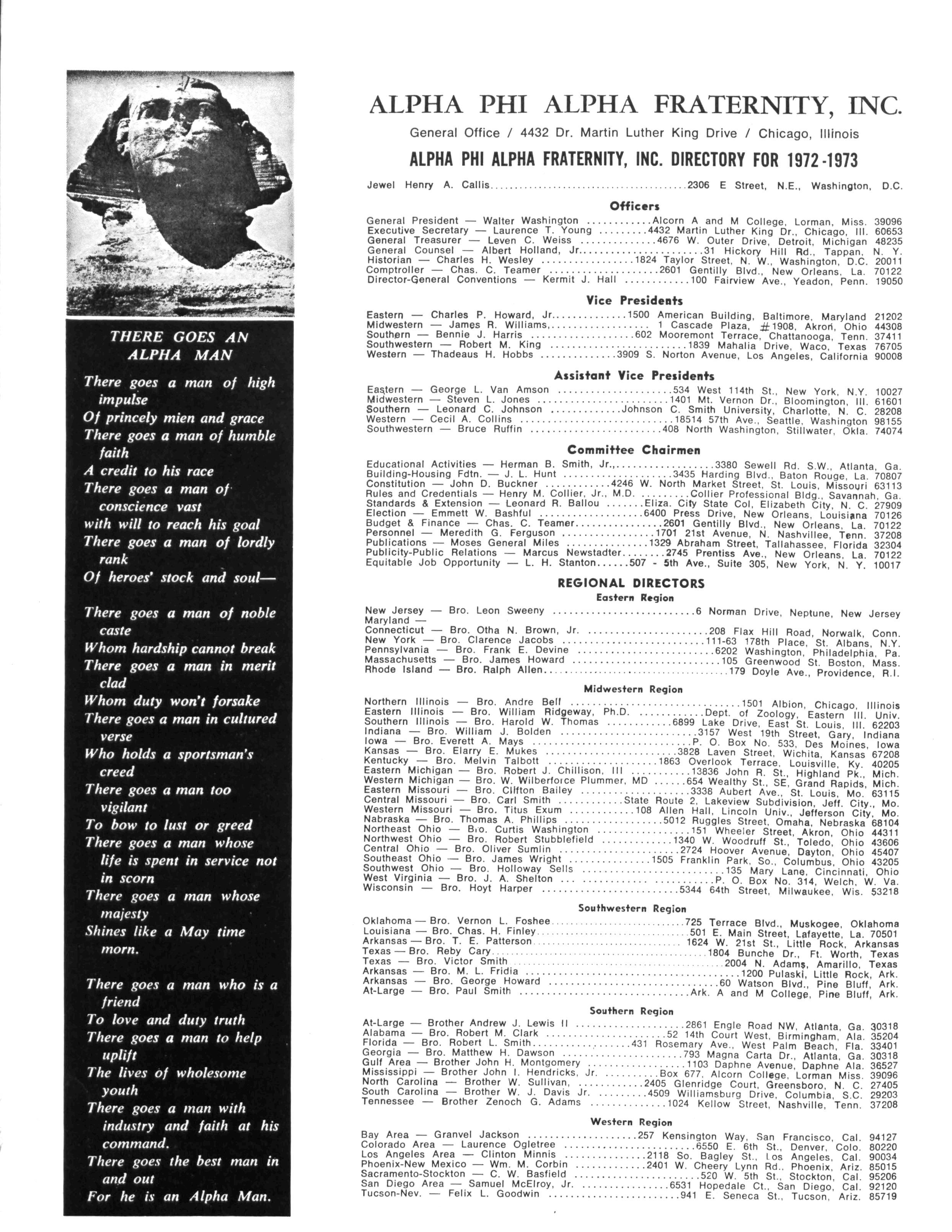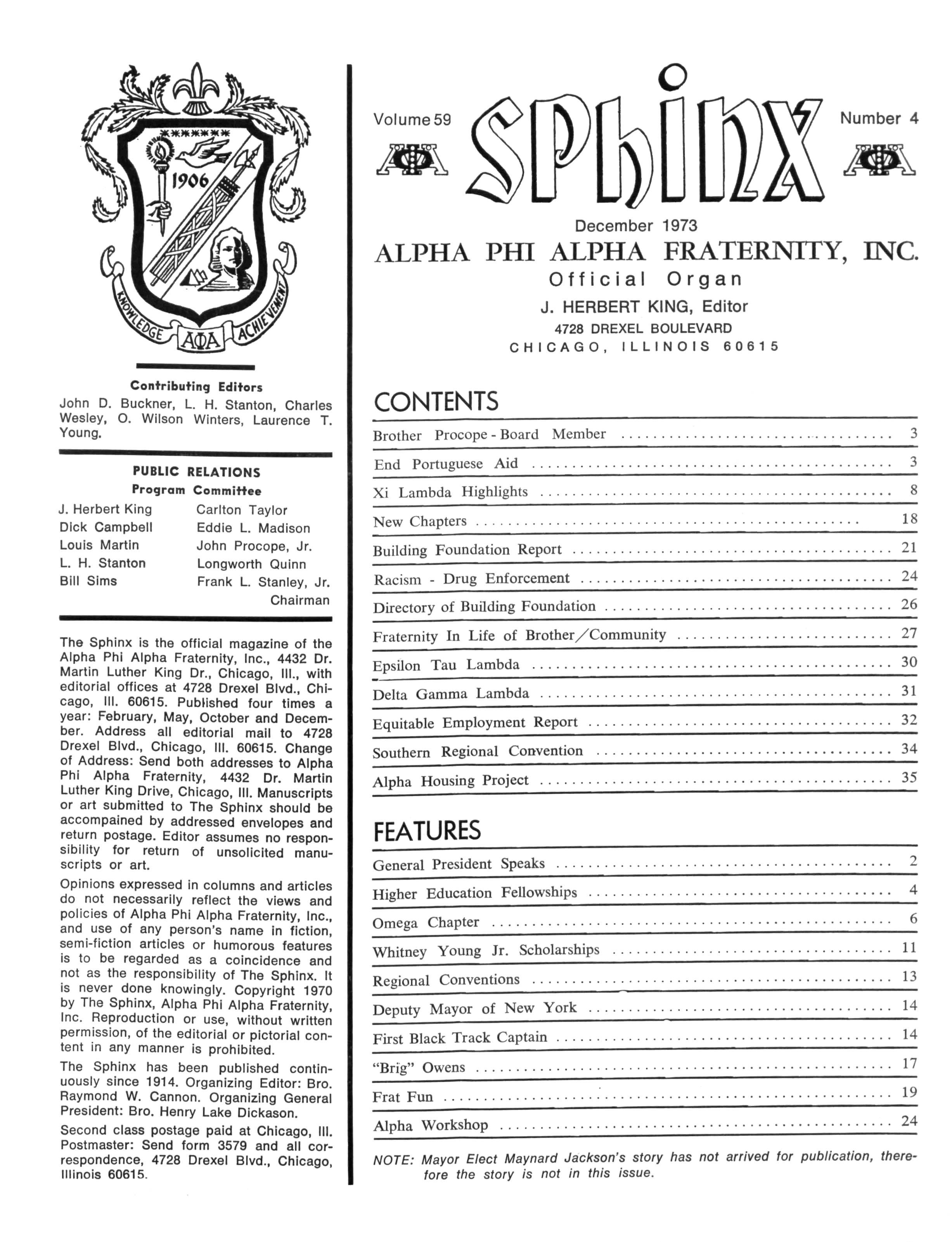 The Sphinx is the official magazine of the Alpha Phi Alpha Fraternity, Inc., 4432 Dr Martin Luther King Dr., Chicago, III., with editorial offices at 4728 Drexel Blvd., Chicago, III 60615 Published four times a year: February, May, October and December Address all editorial mail to 4728 Drexel Blvd., Chicago, III 60615 Change of Address: Send both addresses to Alpha Phi Alpha Fraternity, 4432 Dr Martin Luther King Drive, Chicago, III Manuscripts or art submitted to The Sphinx should be accompained by addressed envelopes and return postage Editor assumes no responsibility for return of unsolicited manuscripts or art