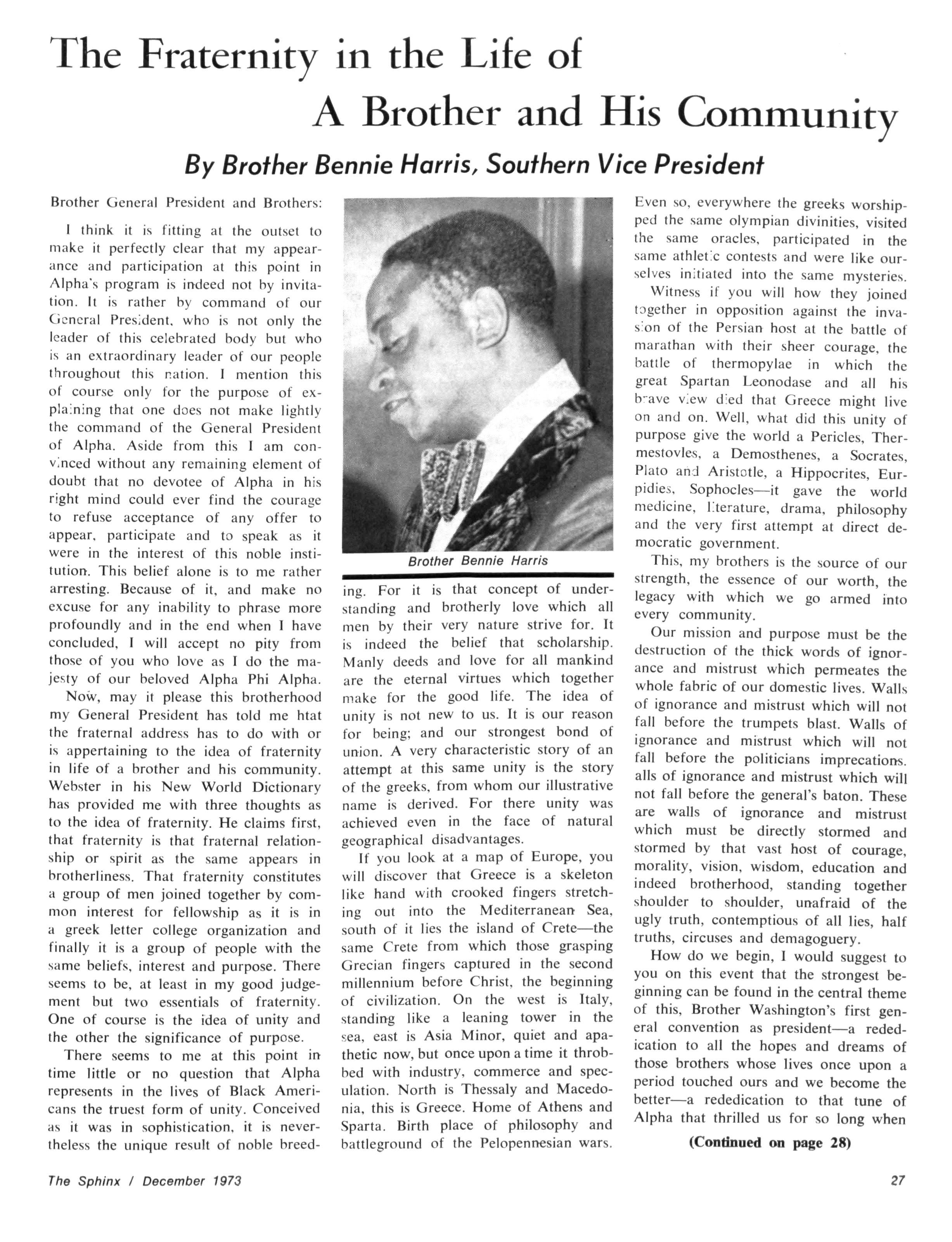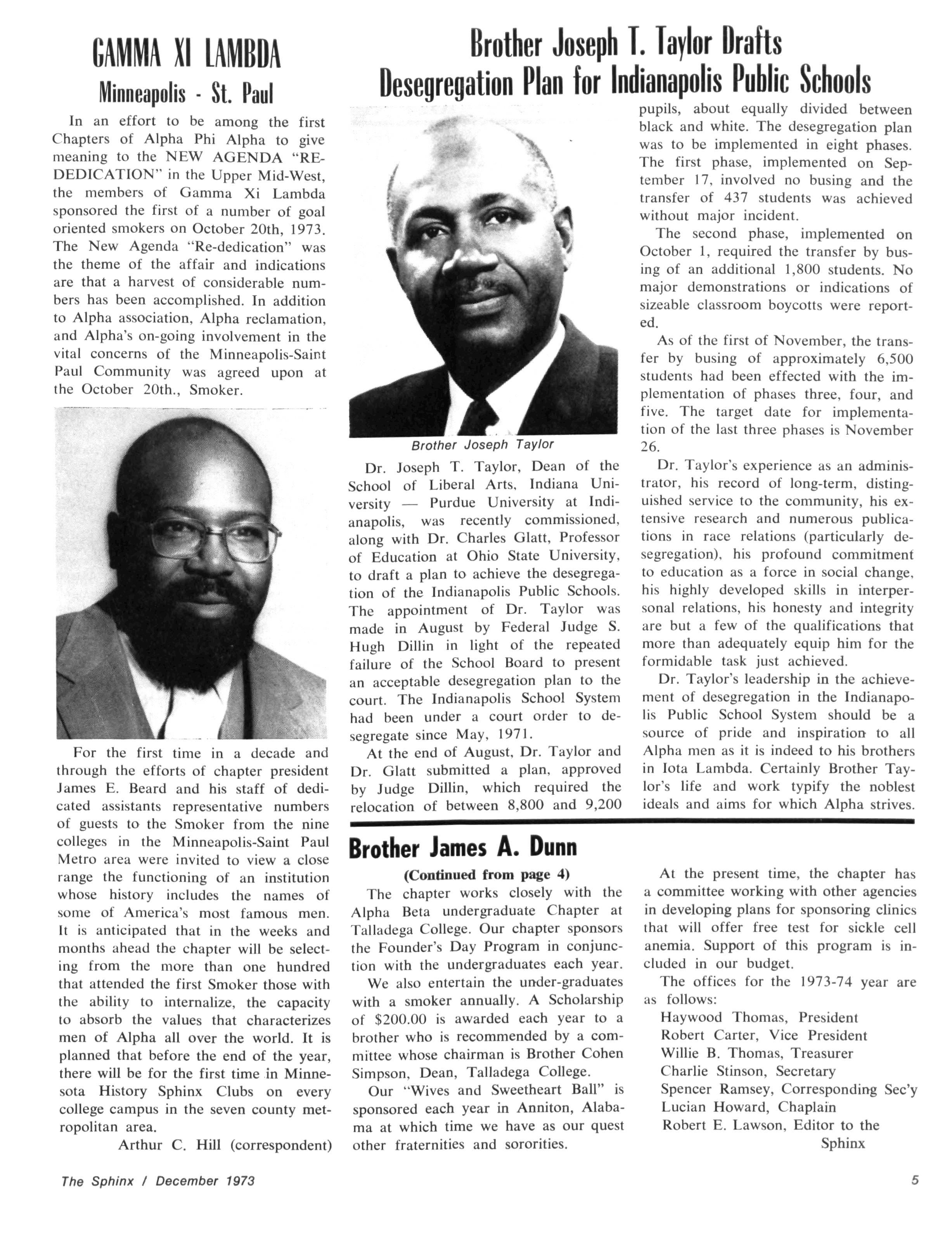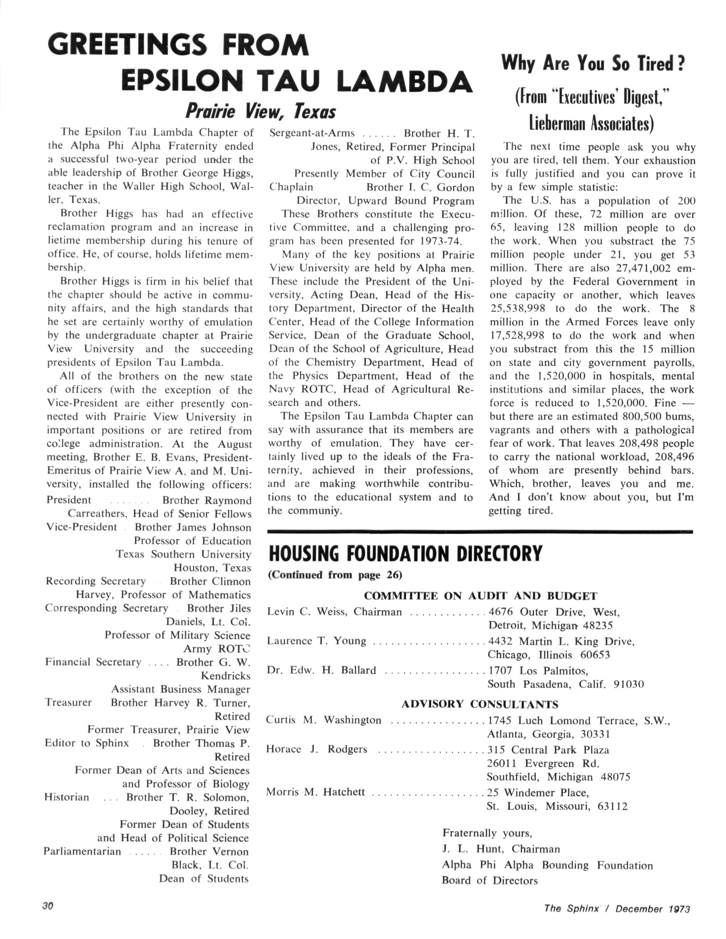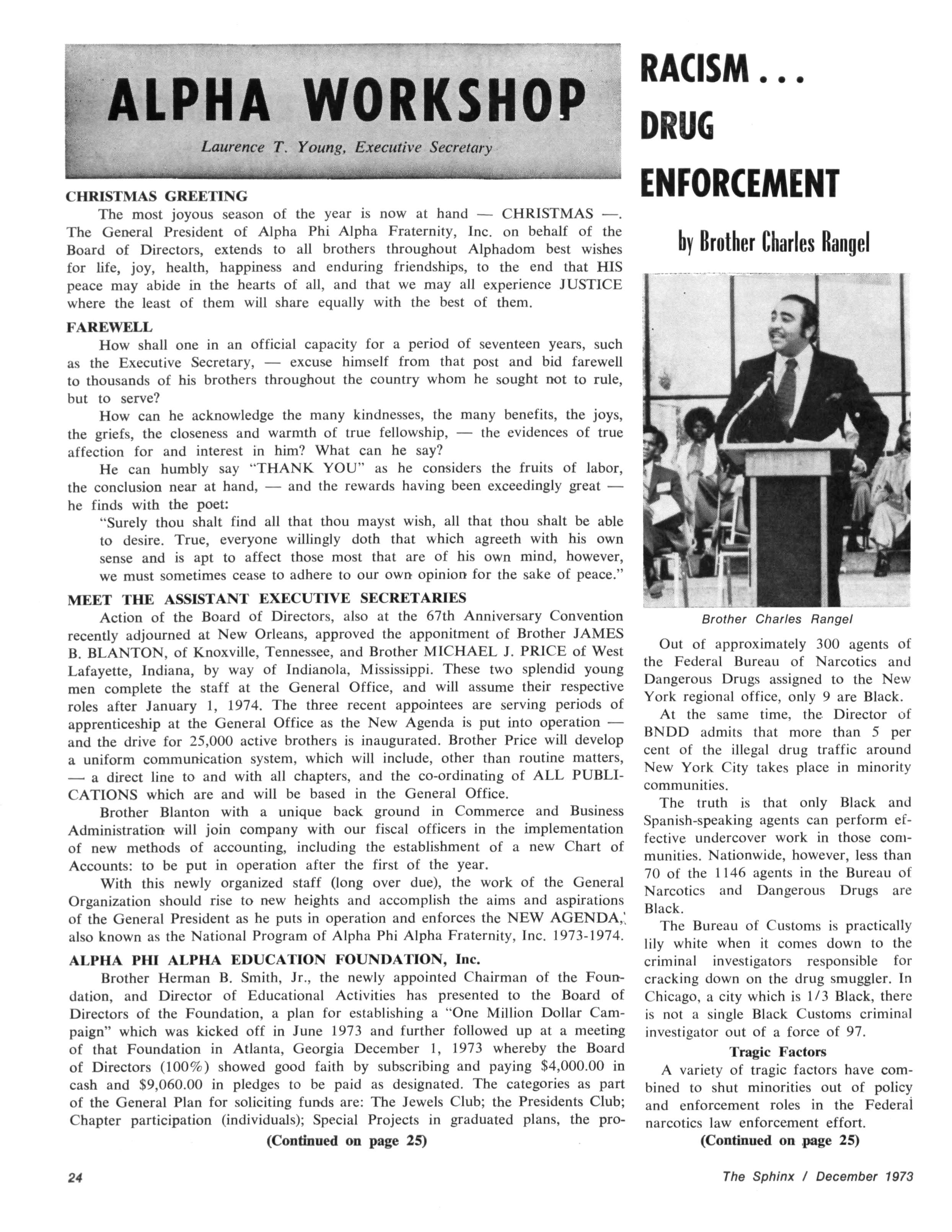 The Sphinx is the official magazine of the Alpha Phi Alpha Fraternity, Inc., 4432 Dr Martin Luther King Dr., Chicago, III., with editorial offices at 4728 Drexel Blvd., Chicago, III 60615 Published four times a year: February, May, October and December Address all editorial mail to 4728 Drexel Blvd., Chicago, III 60615 Change of Address: Send both addresses to Alpha Phi Alpha Fraternity, 4432 Dr Martin Luther King Drive, Chicago, III Manuscripts or art submitted to The Sphinx should be accompained by addressed envelopes and return postage Editor assumes no responsibility for return of unsolicited manuscripts or art