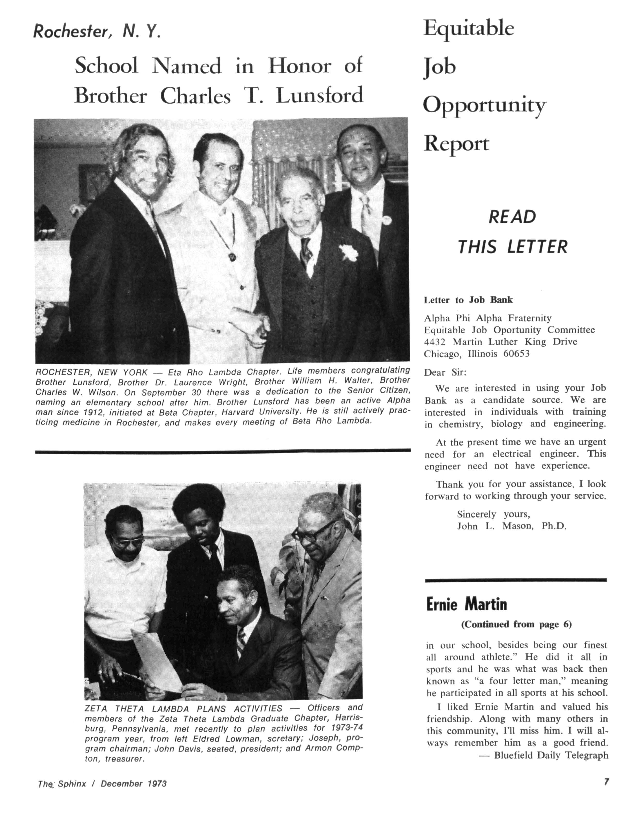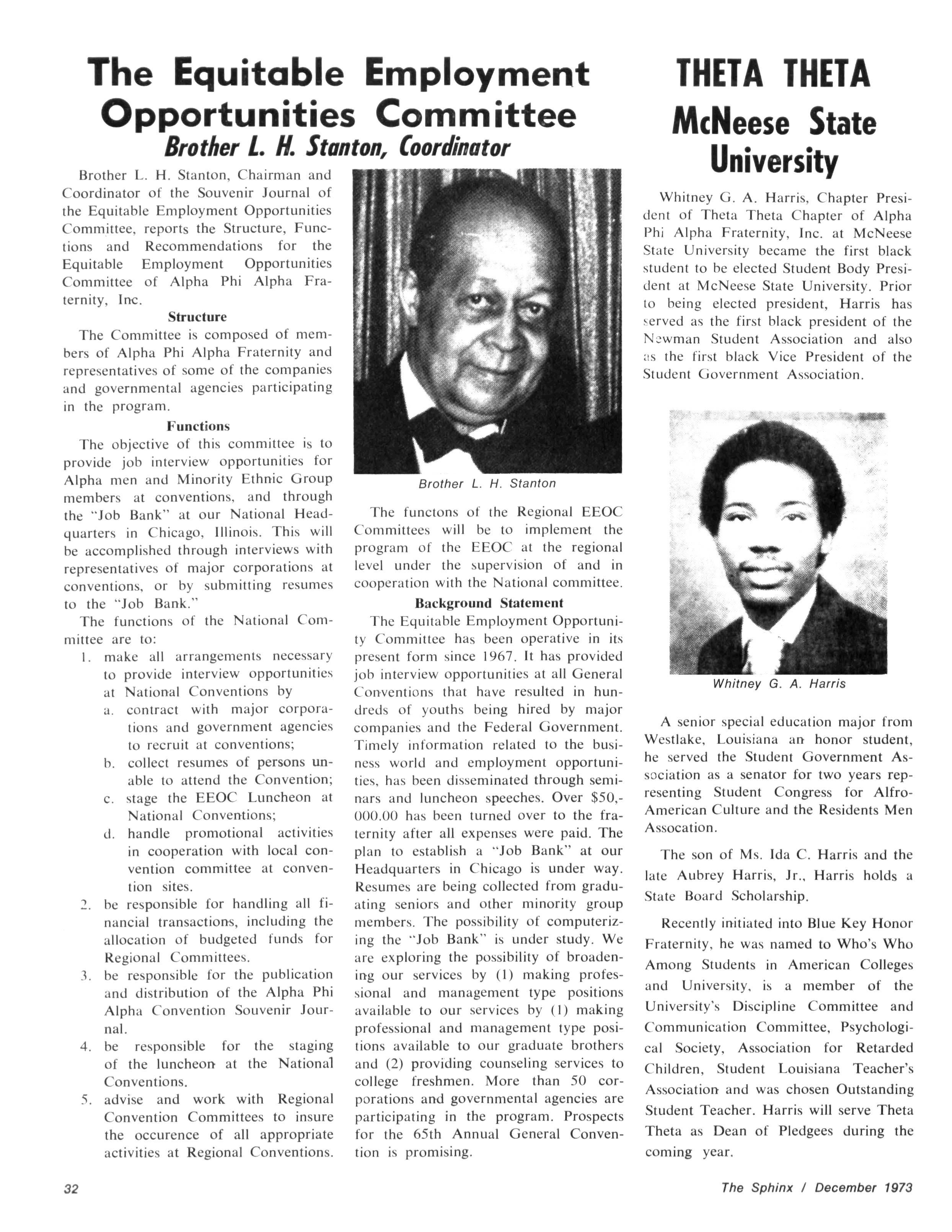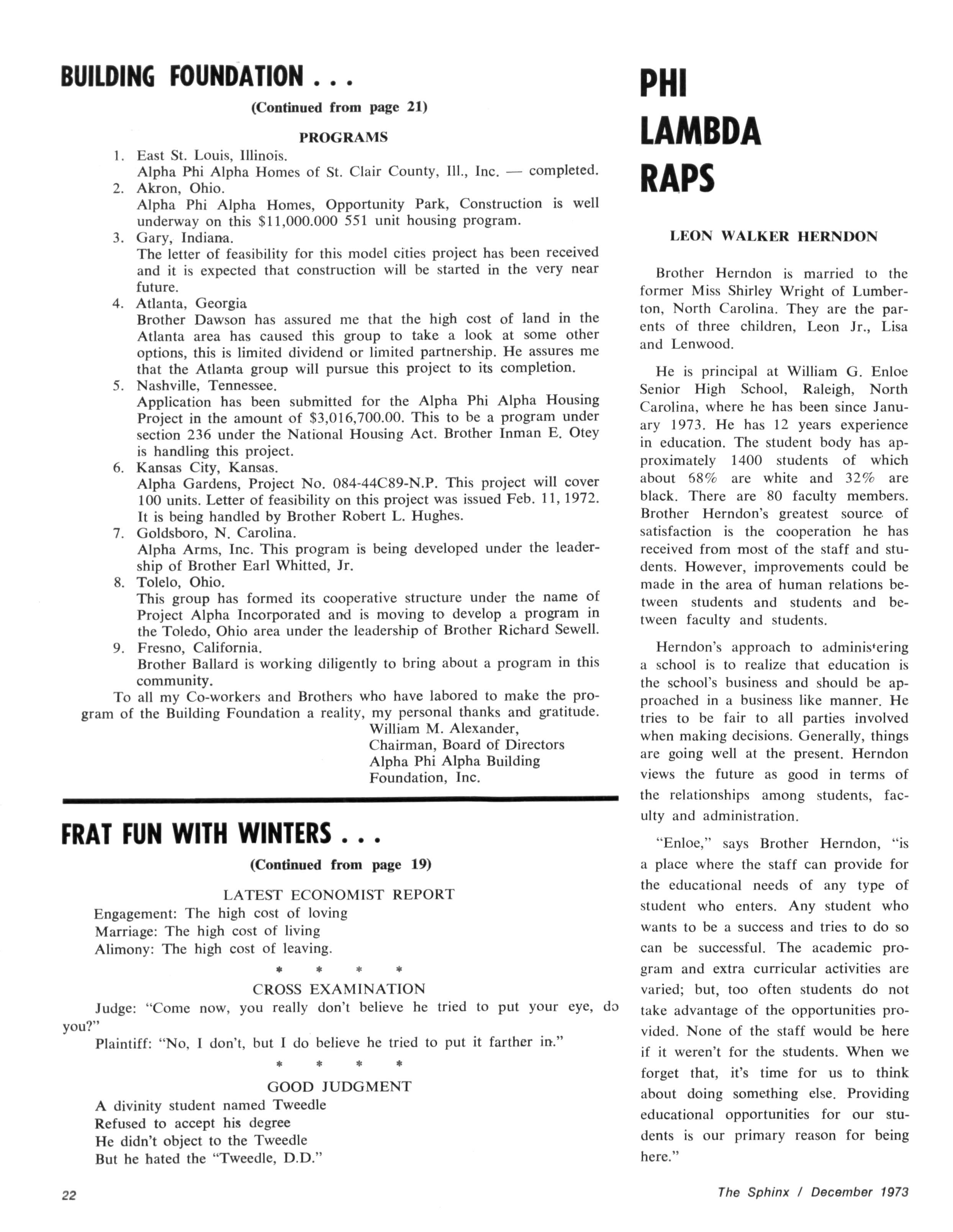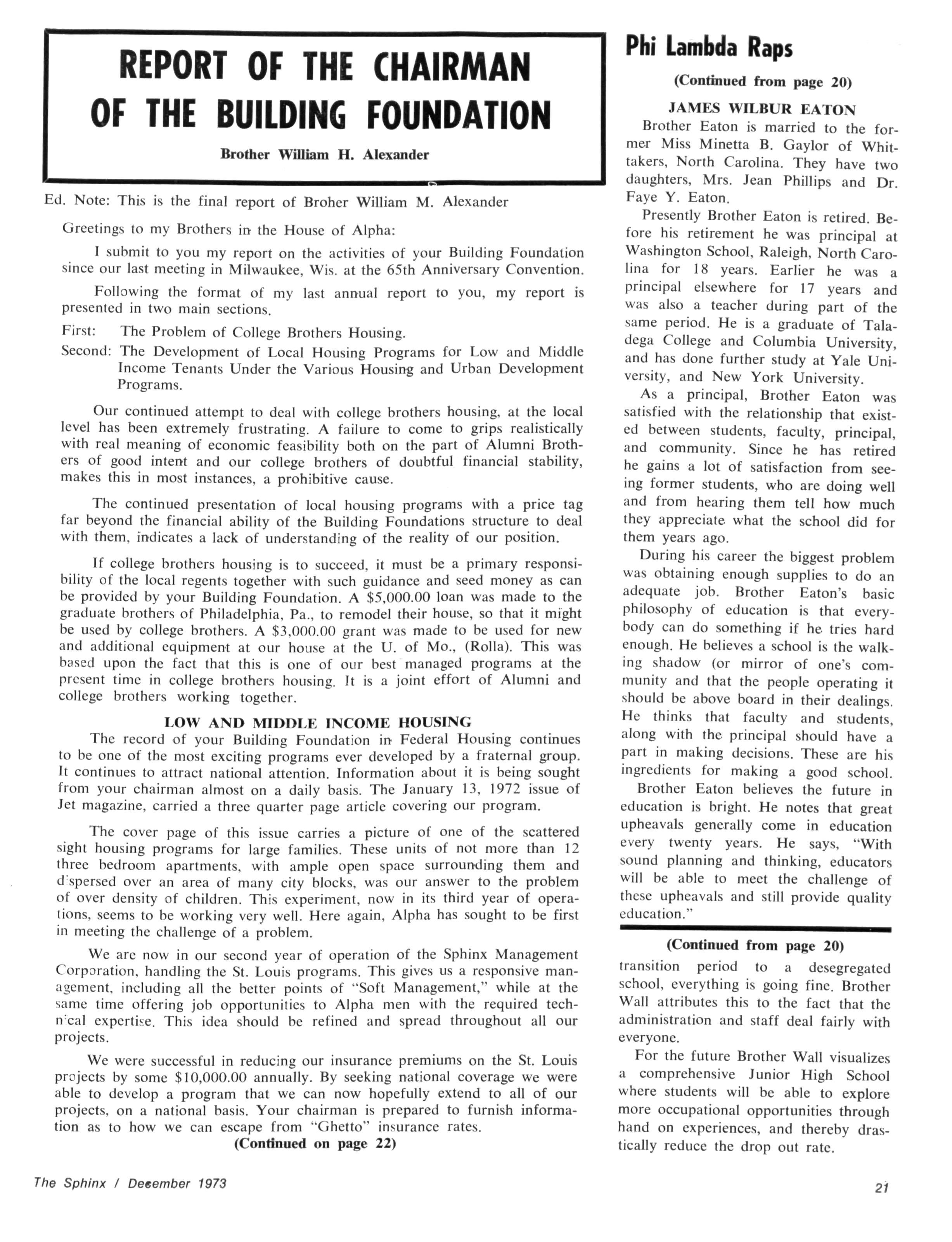 The Sphinx is the official magazine of the Alpha Phi Alpha Fraternity, Inc., 4432 Dr Martin Luther King Dr., Chicago, III., with editorial offices at 4728 Drexel Blvd., Chicago, III 60615 Published four times a year: February, May, October and December Address all editorial mail to 4728 Drexel Blvd., Chicago, III 60615 Change of Address: Send both addresses to Alpha Phi Alpha Fraternity, 4432 Dr Martin Luther King Drive, Chicago, III Manuscripts or art submitted to The Sphinx should be accompained by addressed envelopes and return postage Editor assumes no responsibility for return of unsolicited manuscripts or art