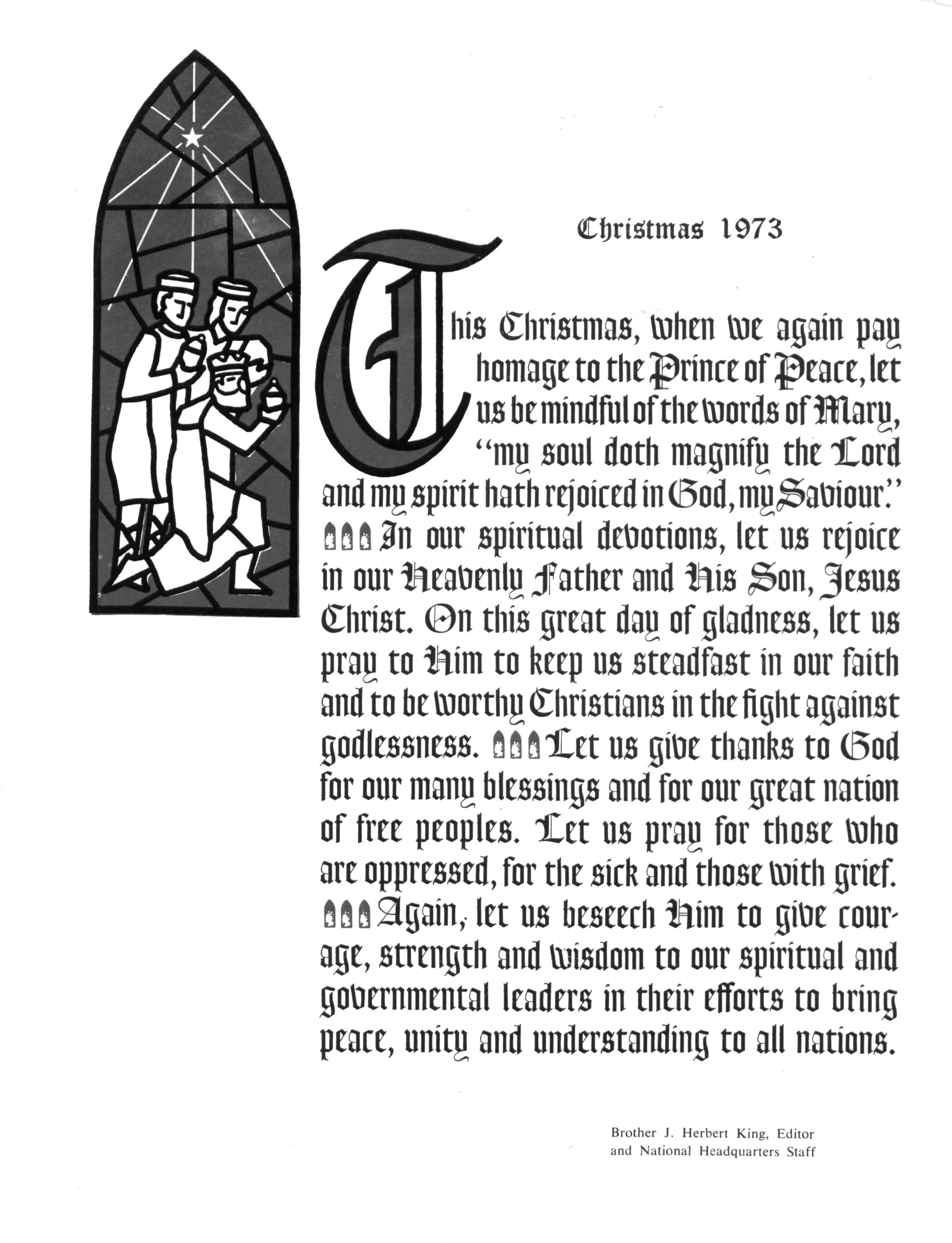 his Christmas,ttihentoeagain pag homagetotheprinceofpeace,let usbemindfulofthetaordsofMarjj, "m$j soul doth magnify the Cord andmgspirithathrejoicedin(Sod,mjj^atiiour!' flfifiln our spiritual demotions, let us rejoice in ourfteatoenlji jfather and ftis ^on, Jesus Christ. On this great dag ofgladness, let us pray to ftim to keep us steadfast in our faith andtobettiorthgChristiansinthefightagainst godlessness. flfifiXet us gtoe thanks to (Sod forourmanjj blessings andforourgreat nation of free peoples. Xet us pray for those toho areoppressed,forthesickandthosefioithgrief fififiagain, let us beseech ftim to gtoe courage, strength andtoisdomto ourspiritual and governmental leaders in their efforts to bring peace, unitg and understanding to all nations.