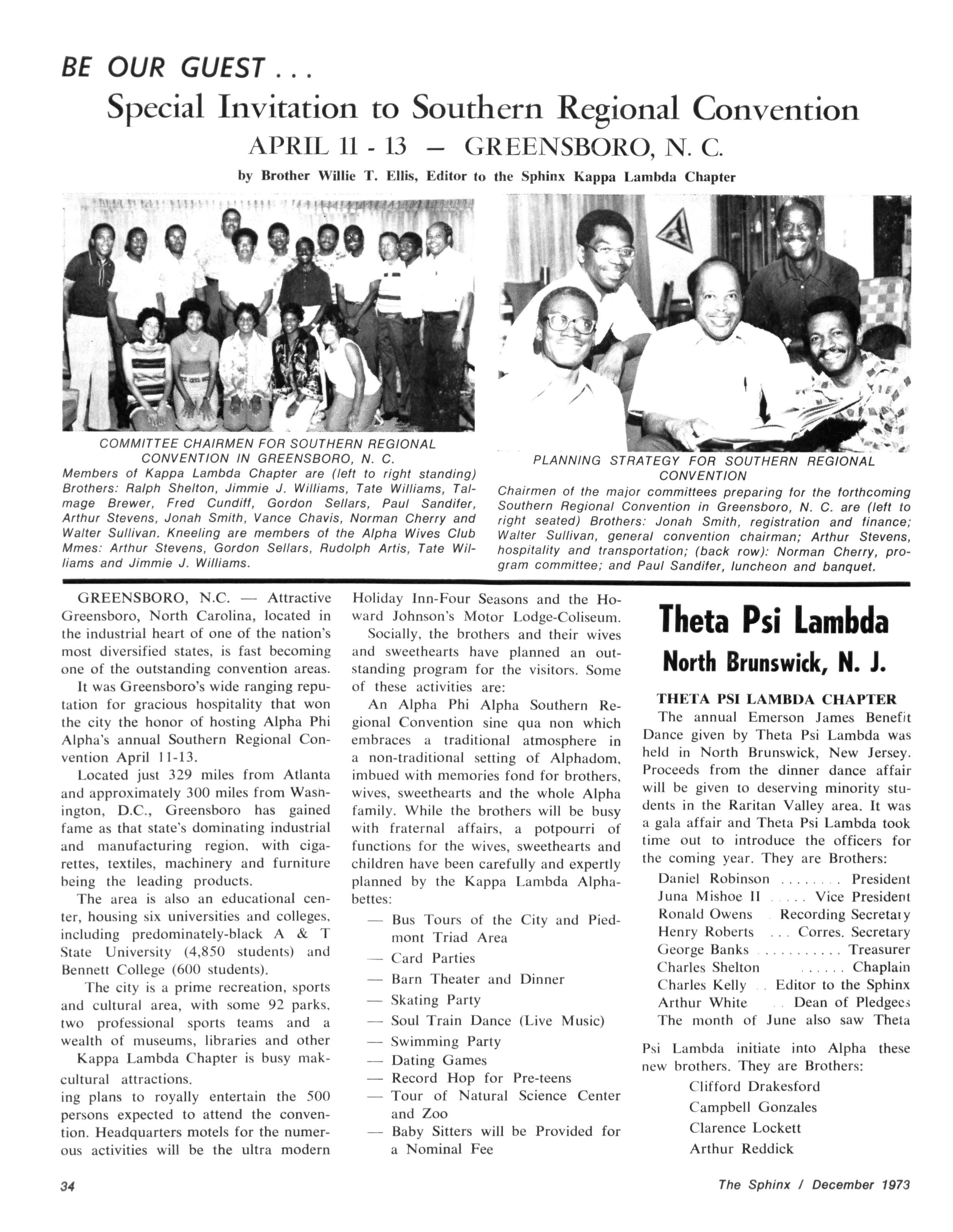 An Alpha Phi Alpha Southern Regional Convention sine qua non which embraces a traditional atmosphere in a non-traditional setting of Alphadom, imbued with memories fond for brothers, wives, sweethearts and the whole Alpha family While the brothers will be busy with fraternal affairs, a potpourri of functions for the wives, sweethearts and children have been carefully and expertly planned by the Kappa Lambda Alphabettes: