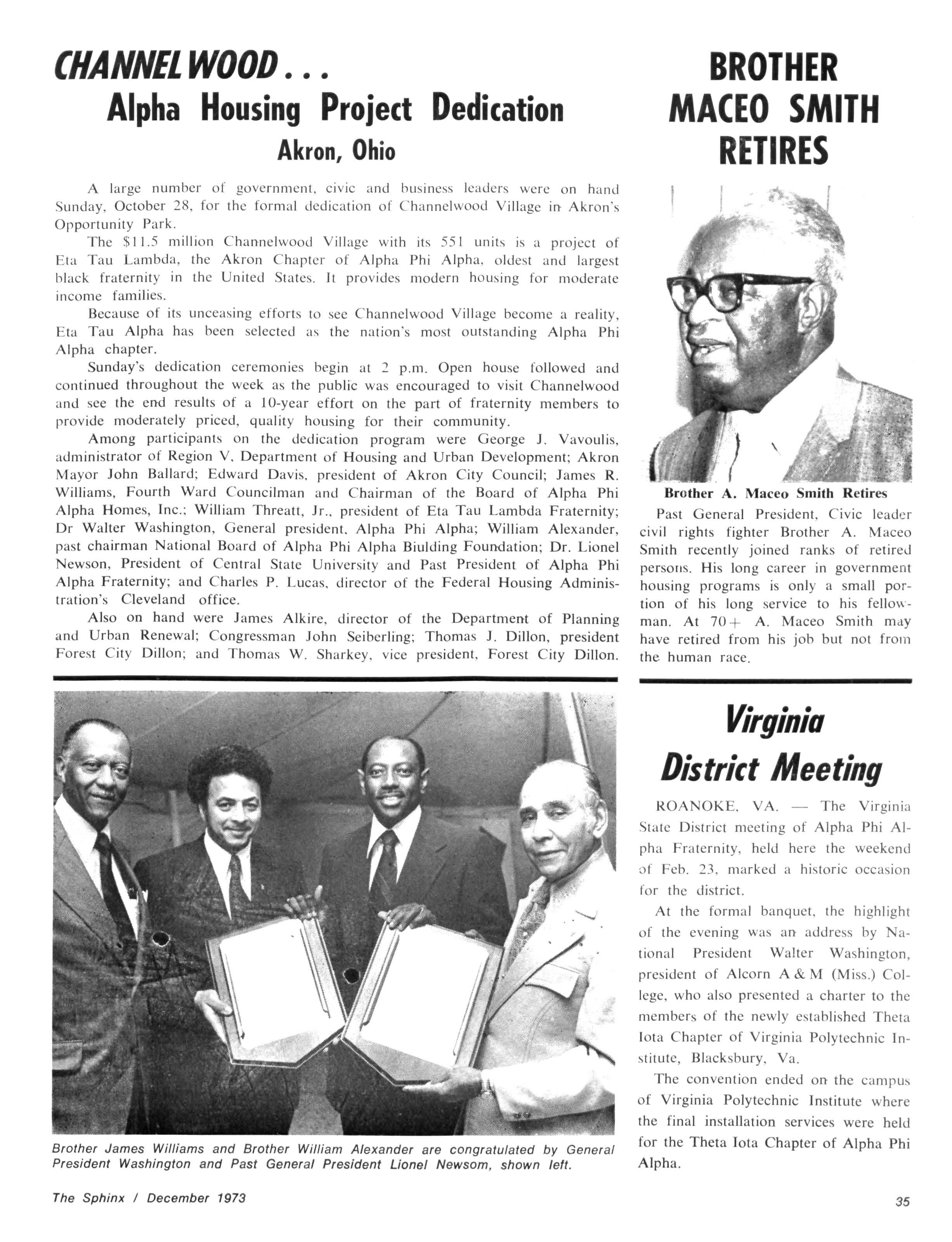 Among participants on the dedication program were George J Vavoulis, administrator of Region V, Department of Housing and Urban Development; Akron Mayor John Ballard; Edward Davis, president of Akron City Council; James R Williams, Fourth Ward Councilman and Chairman of the Board of Alpha Phi Alpha Homes, Inc.; William Threatt, Jr., president of Eta Tau Lambda Fraternity; Dr Walter Washington, General president Alpha Phi Alpha; William Alexander, past chairman National Board of Alpha Phi Alpha Biulding Foundation; Dr. Lionel Newson, President of Central State University and Past President of Alpha Phi Alpha Fraternity; and Charles P Lucas, director of the Federal Housing Administration's Cleveland office.