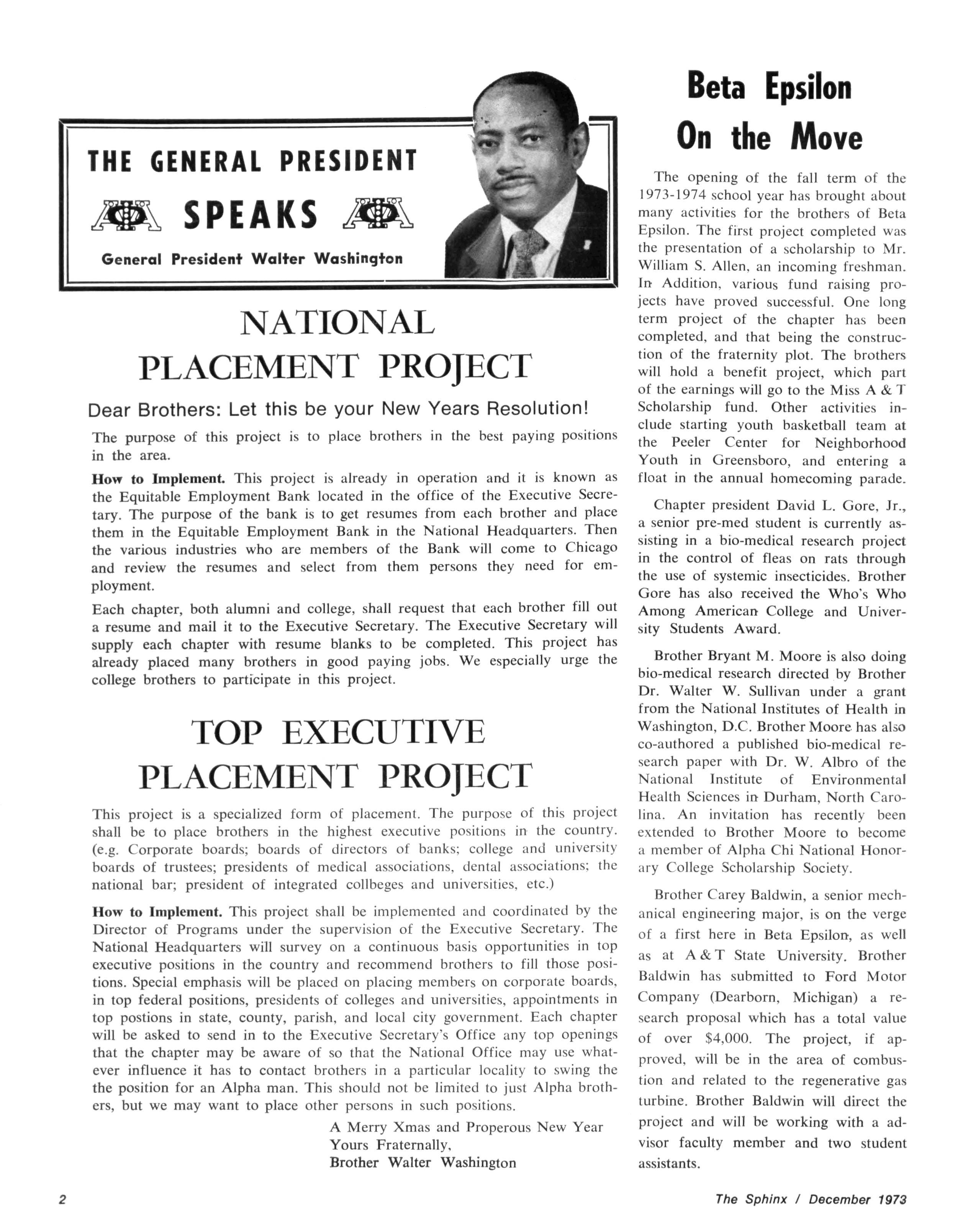 How to Implement. This project shall be implemented and coordinated by the Director of Programs under the supervision of the Executive Secretary The National Headquarters will survey on a continuous basis opportunities in top executive positions in the country and recommend brothers to fill those positions Special emphasis will be placed on placing members on corporate boards, in top federal positions, presidents of colleges and universities, appointments in top postions in state, county, parish, and local city government. Each chapter will be asked to send in to the Executive Secretary's Office any top openings that the chapter may be aware of so that the National Office may use whatever influence it has to contact brothers in a particular locality to swing the the position for an Alpha man This should not be limited to just Alpha brothers, but we may want to place other persons in such positions