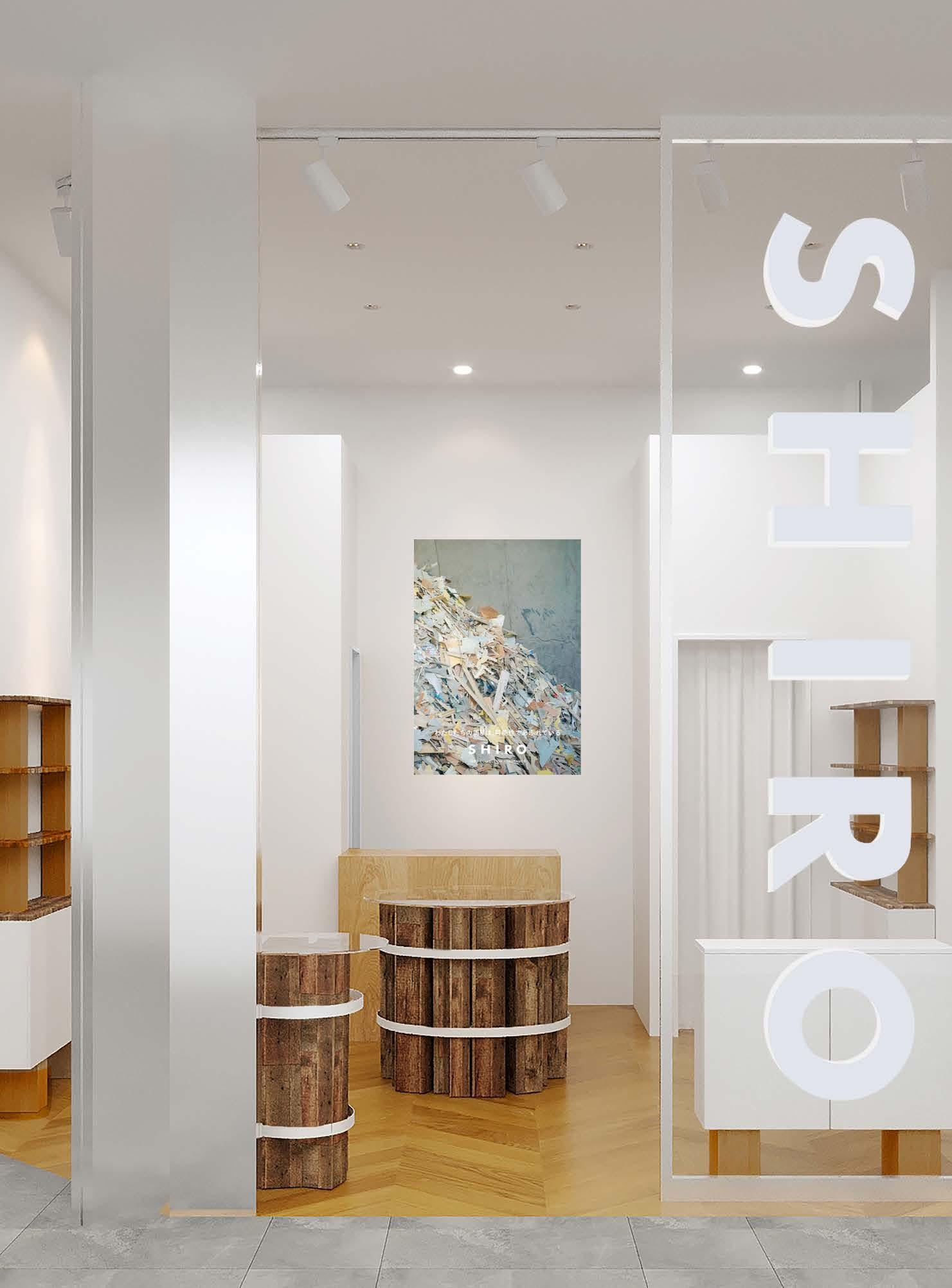 世界各地の商業施設に次々と現れる各種のポップアップストア。シー ズナルアイテムやビジュアルに合わせてつくられる期間限定の売場は見 ていてワクワクします。その時にしか見られない特別なディスプレイ。 華やかに売場を彩る什器や装飾ですが、シーズンが終わると同時に行き 場を失い、廃棄物として捨てられています。商業施設の閉店後に、夜か ら朝にかけて行われる解体作業は、お客様の目にとまることはなく、翌 朝になると次のポップアップストアができあがっているので気がつく人 は少ないかもしれません。「 SHIRO 渋谷 PARCO POP UP STORE 」では、 つくる段階ではもちろん、期間終了後にも廃棄物を出さない店舗づくり をしました。