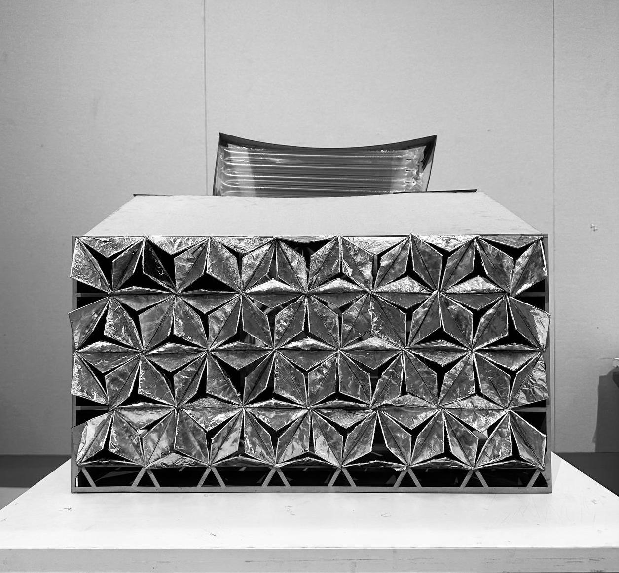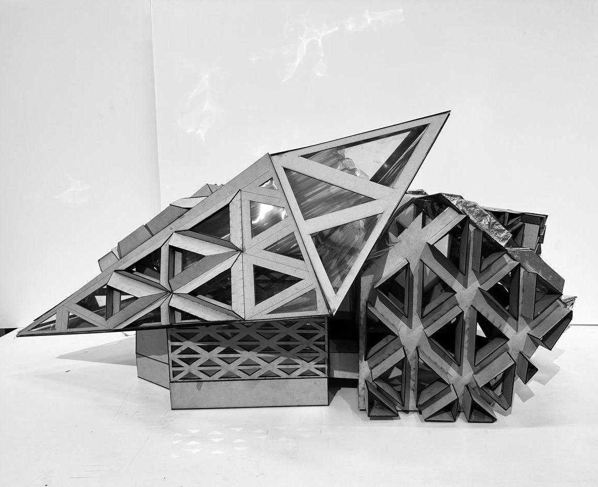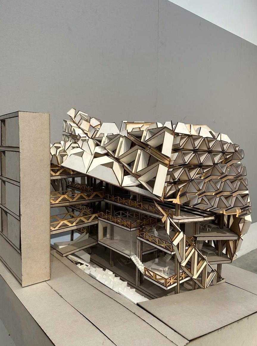Each triangular module varies in size, density, and angle based on solar exposure and wind direction, creating a gradient of brightness and ventilation across the façade. Areas requiring focused, quiet work. Such as private study rooms or offices are shielded with tighter, smaller fins to reduce glare and create calm, softly lit environments. In contrast, communal zones like seminar rooms or shared lounges open up to daylight and airflow, enhancing sociability and alertness.