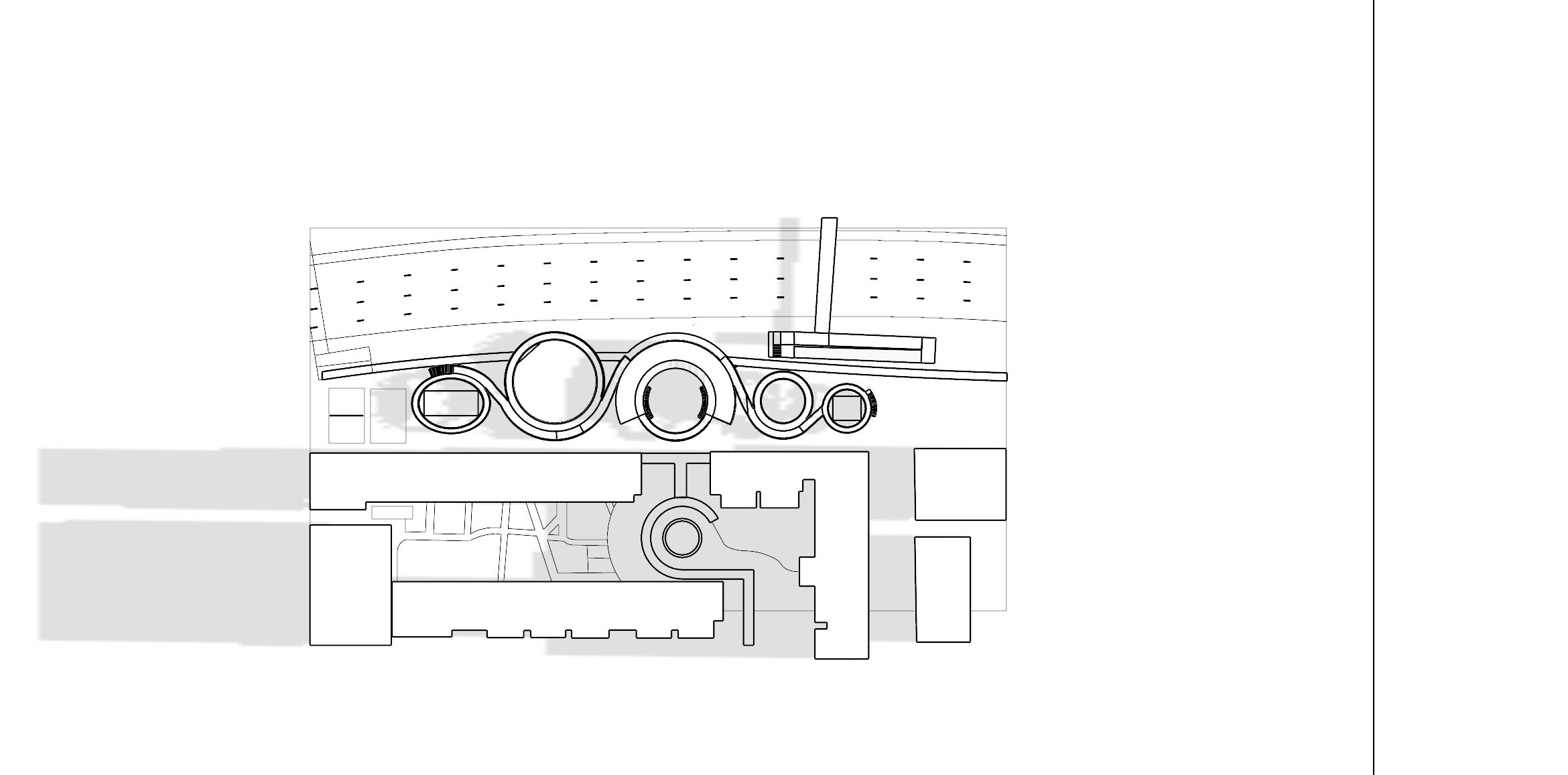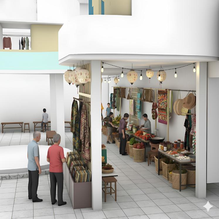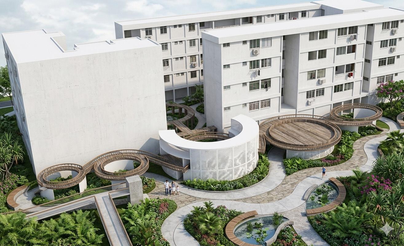 The design builds upon existing community elements, such as the circular sheltered walkways, extending them into a larger spatial system. Circular geometry becomes both a formal and organizational strategy, informing the design of elevated skywalks that guide circulation and link different zones.