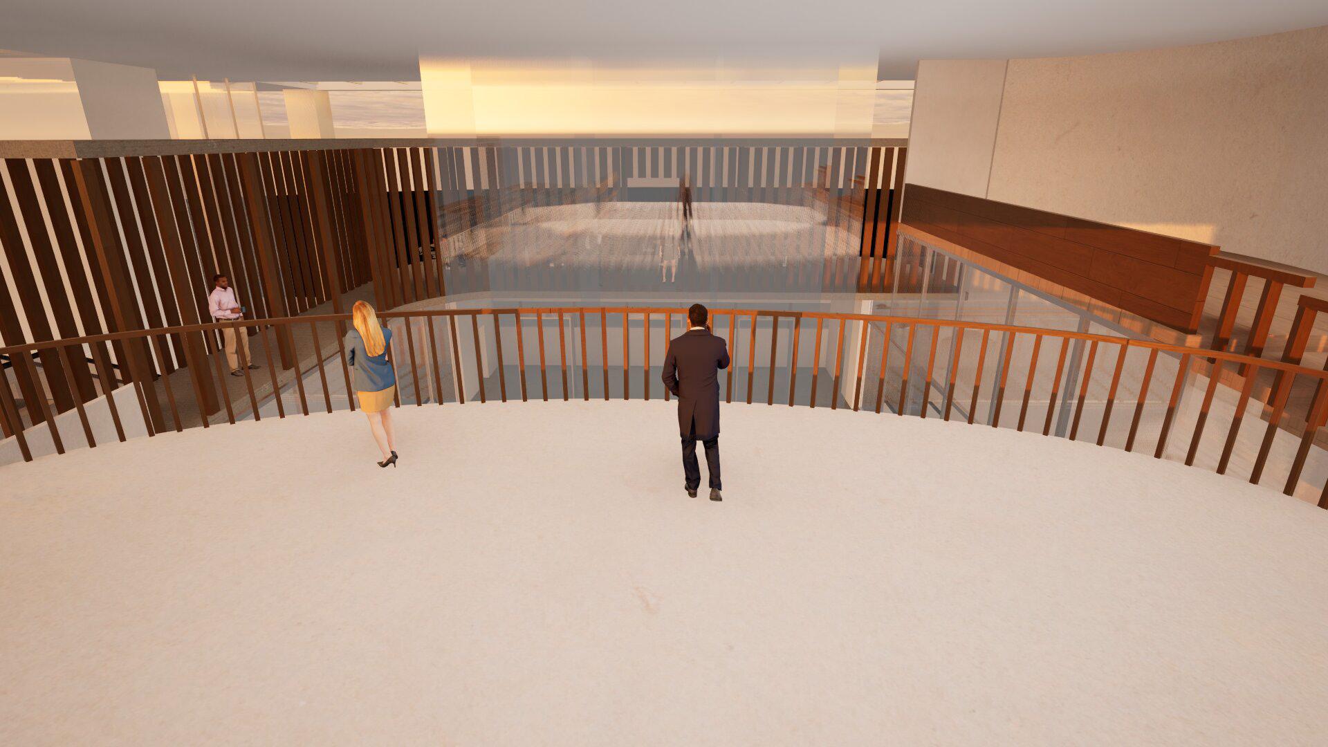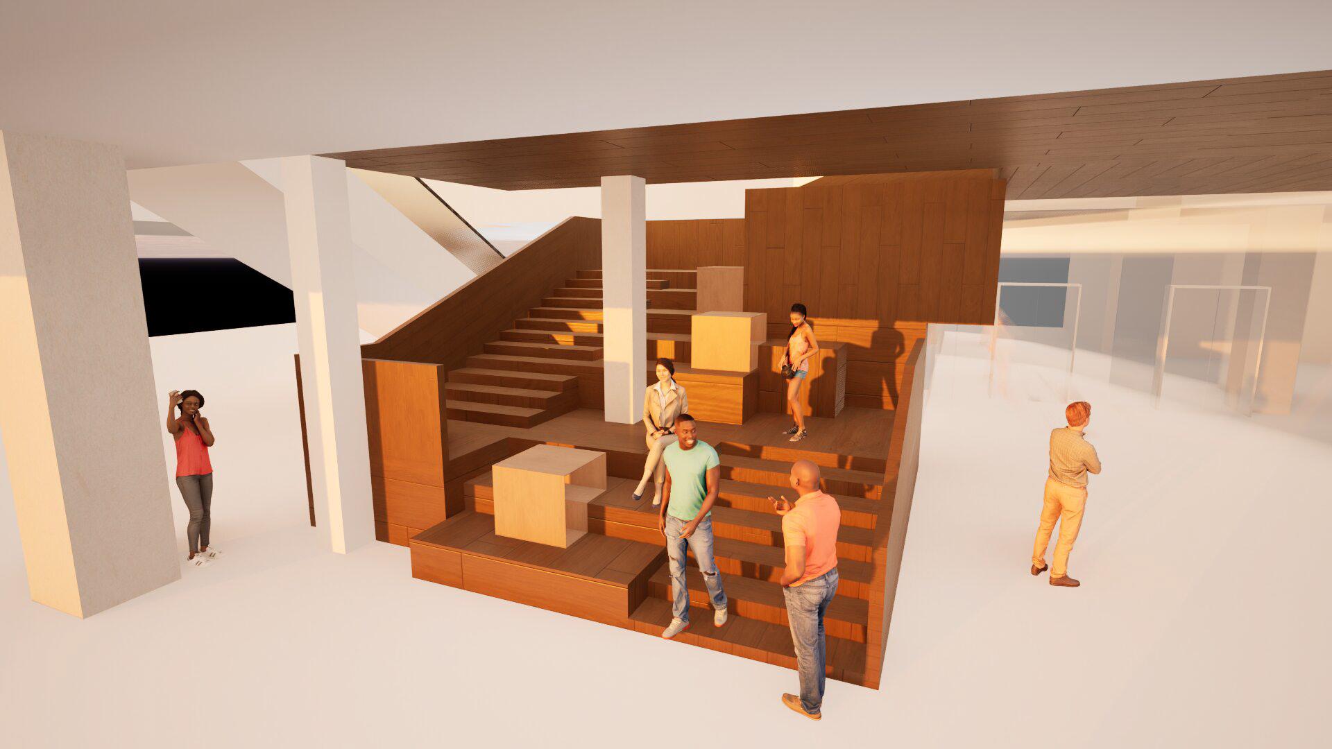 This sectional perspective illustrates how the upper, middle, and lower levels are vertically connected through the shared atrium. The platforms surrounding the central void create a theatre effect — people on the upper levels can look down toward the performance stage below, while those in the basement can look upward, fostering visual interaction and spatial engagement. This vertical relationship activates the transportation hub, transforming it into a vibrant, multifunctional center.