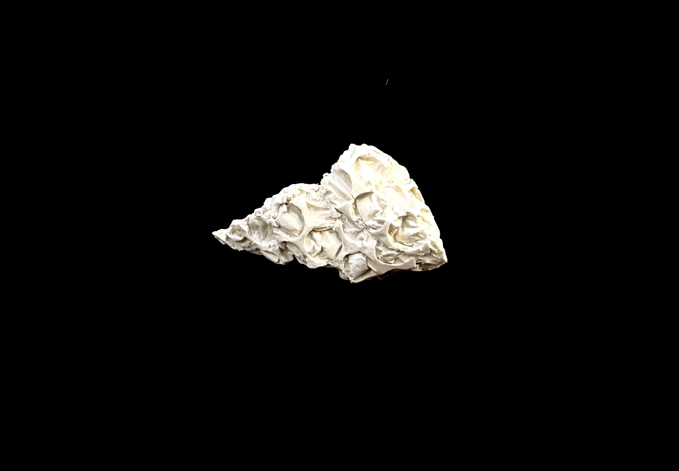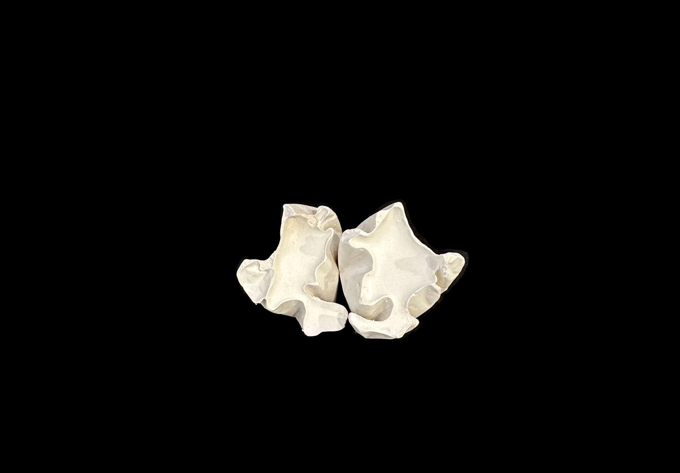 The resulting models reveal folds, valleys, ridges, and inward-curving edges, formed as the plaster flows into the small creases and cavities of the plastic.