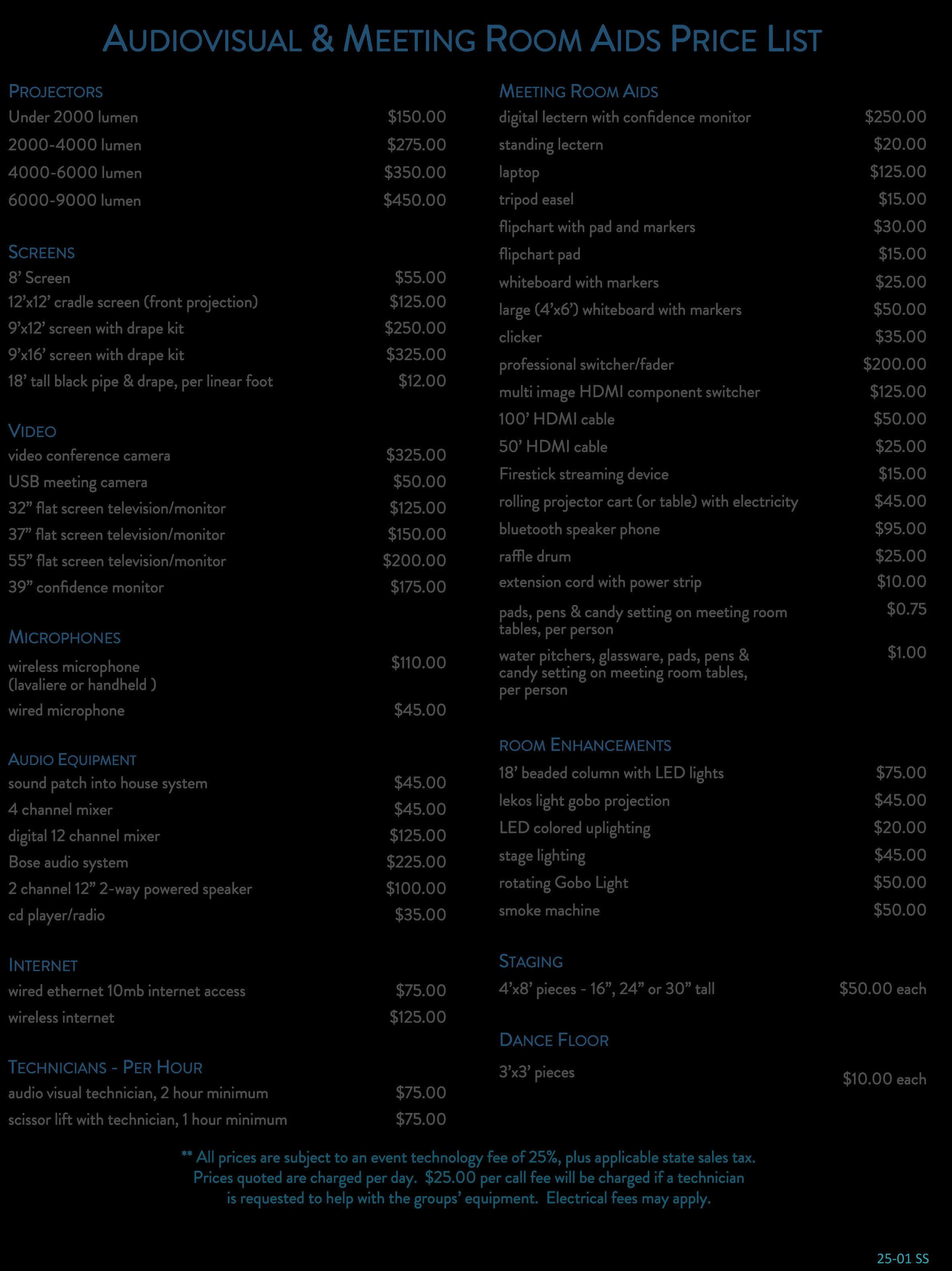 All food and beverage are subject to service charge (currently 25%) and applicable sales tax.