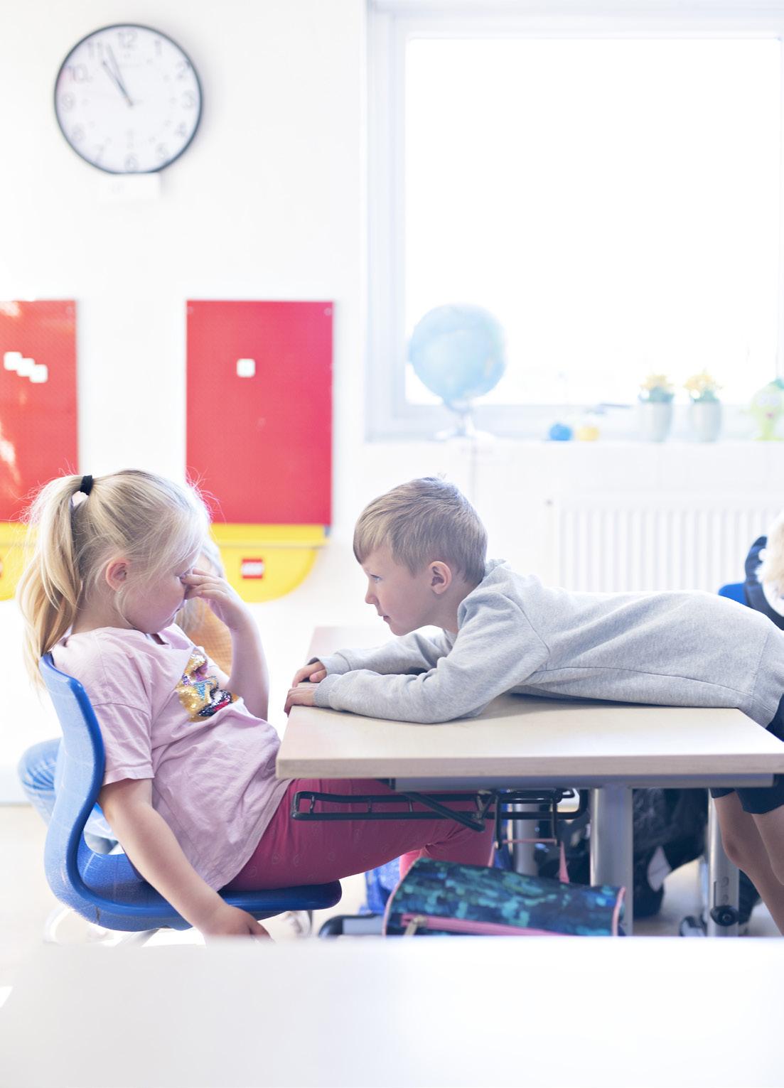 Hvad synes du, er det vigtigste, man skal lære i skolen? Det vigtigste er at lære at lytte til, hvad andre folk er i gang med at sige. Hvis jeg nu var min lærer Tine, og jeg sagde ”Okay, nu skal vi i gang med side 78, så skal vi det, og så skal vi det”, og der var en elev, der sad og fjollede imens og bagefter sagde ’øh, hvad skal jeg nu’ – det er jo dumt. Man skal også lære at sidde stille på stolen og ikke drille hinanden.