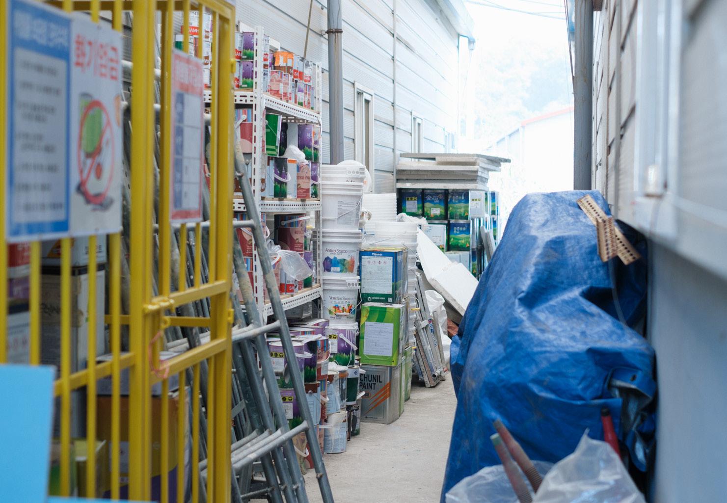 高速道路を北に向かって車を走らせ、 京 キョンギド 畿道 南 ナミャンジュ 楊州 市 シ ( 경기도 남양주시 ) へ。 SHIRO Seongsu の壁を塗装してくださった、ウス・デザイン( 우수디 자인 )を訪ねました。塗料の調色から、現場での塗装までを担う塗装業者 です。ガレージの脇に積み上げられた一斗缶が目に留まりました。代表の ナム・ジェウさんに尋ねると、工事現場で余った塗料を持ち帰り、積み上 げているといいます。工事現場では、仕様変更や作業ミスを見越して、塗 料を少し多く発注するのが慣例です。これは塗料に限らず建材全般に言え ること。余った部材は、新品にも関わらず廃棄されてしまうこともあります。 フードロスならぬ、建材ロス問題。