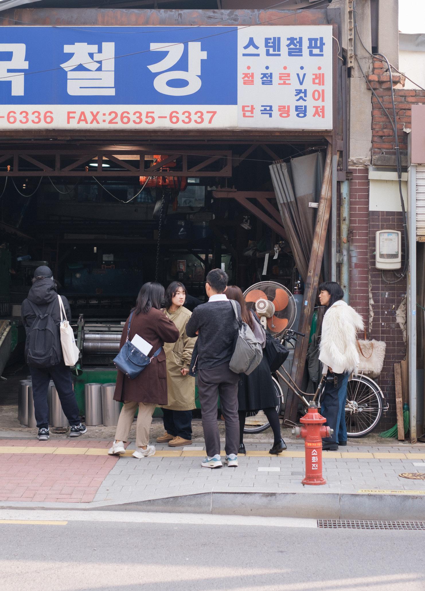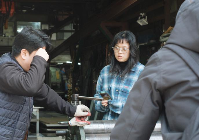 最初に向かったのは 文 ムンレドン 来洞 。政治と金融の中心地・ 汝 ヨ 矣 イ 島 ド の北西に位 置する、鉄鋼業で栄えた街です。工場移転政策と再開発により鉄工所の数 が減少し続け、かつて 2,000 件以上あった鉄工所は、現在ではおよそ半 分に減少しています。空き家となった工場に目をつけたアーティストがアト リエを構えたり、カフェやレストランにリノベーションしたり、ムンレドンは 若者の街へと変化しています。そんなムンレドンで工場を構えて 50 年、家 族経営の鉄工所「韓国鉄鋼( 한국철강 )」を訪ね、長女のソン・ジヘさんに お話を伺いました。ムンレドンの街の様子は、この 10 年ほどで大きく変わ ったといいます。