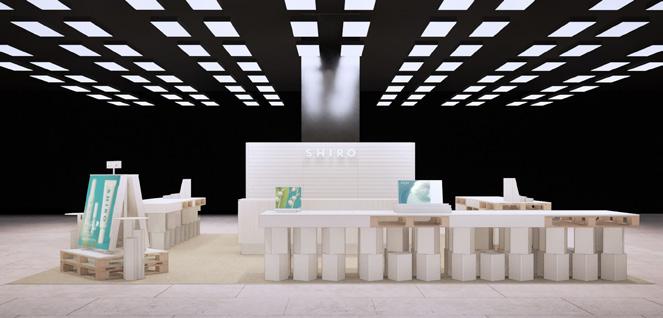 もうひとつ、SHIROのお店づくりを語る上で欠かせないキ ワ ドがあ ります。それは「捨てない」お店づくり。できるだけバージン材を使用しな い。端材が出ないように心がけ、端材が出たら使い切る方法を考える。捨 てる前に、他のお店で使用することを考える。ポップアップストアは、解体 後にリユース リサイクルしやすいように配慮して設計するなど、環境負荷 を最小限にするお店づくりを実践しています。