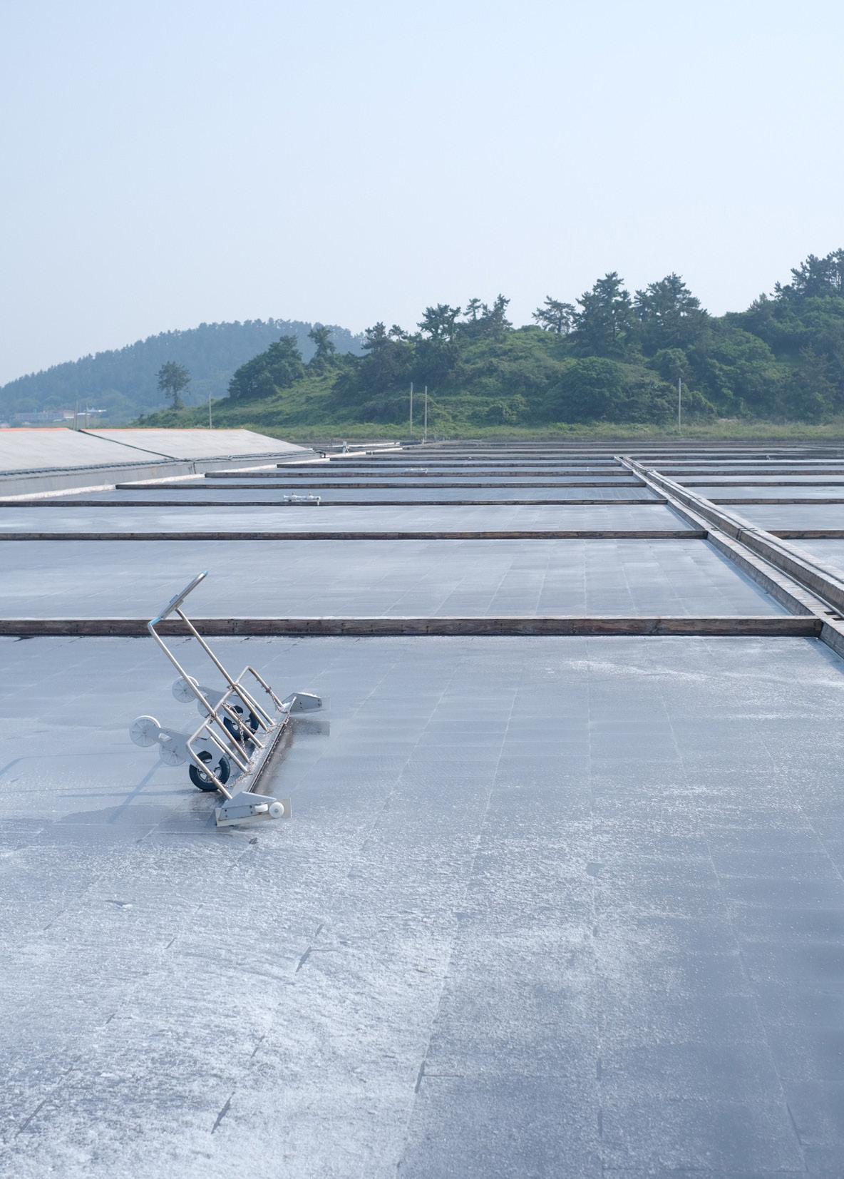 なんて美しい風景だろう。目の前に広がる塩田を見て、編集部のメンバ ーたちは言葉を失い、夢中でカメラのシャッターを切っていました。 2025 年 5 月、 SHIRO PAPER 編集部は韓国・ 新 シナン 安 を訪れました。韓国の素材 に出会うためです。シナンは韓国の南西部、 全 チョルラナムド 羅南道と呼ばれるエリアの 海に浮かぶ島。大小 1,000を超える島々から成る群島です。ソウルからは 地方都市である木 モッポ 浦まで KTX (韓国の新幹線)で 2 時間半。さらにそこか らフェリーで 2 時間。観光地として訪れる人は多くなく、モッポに到着してか らは日本の観光客に出会うことは一度もありませんでした。長時間をかけて 辿り着いたシナンは、観光地の華やかさではなく、人の営みと自然が静か に呼吸を重ねるような美しい島でした。