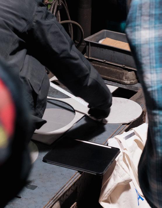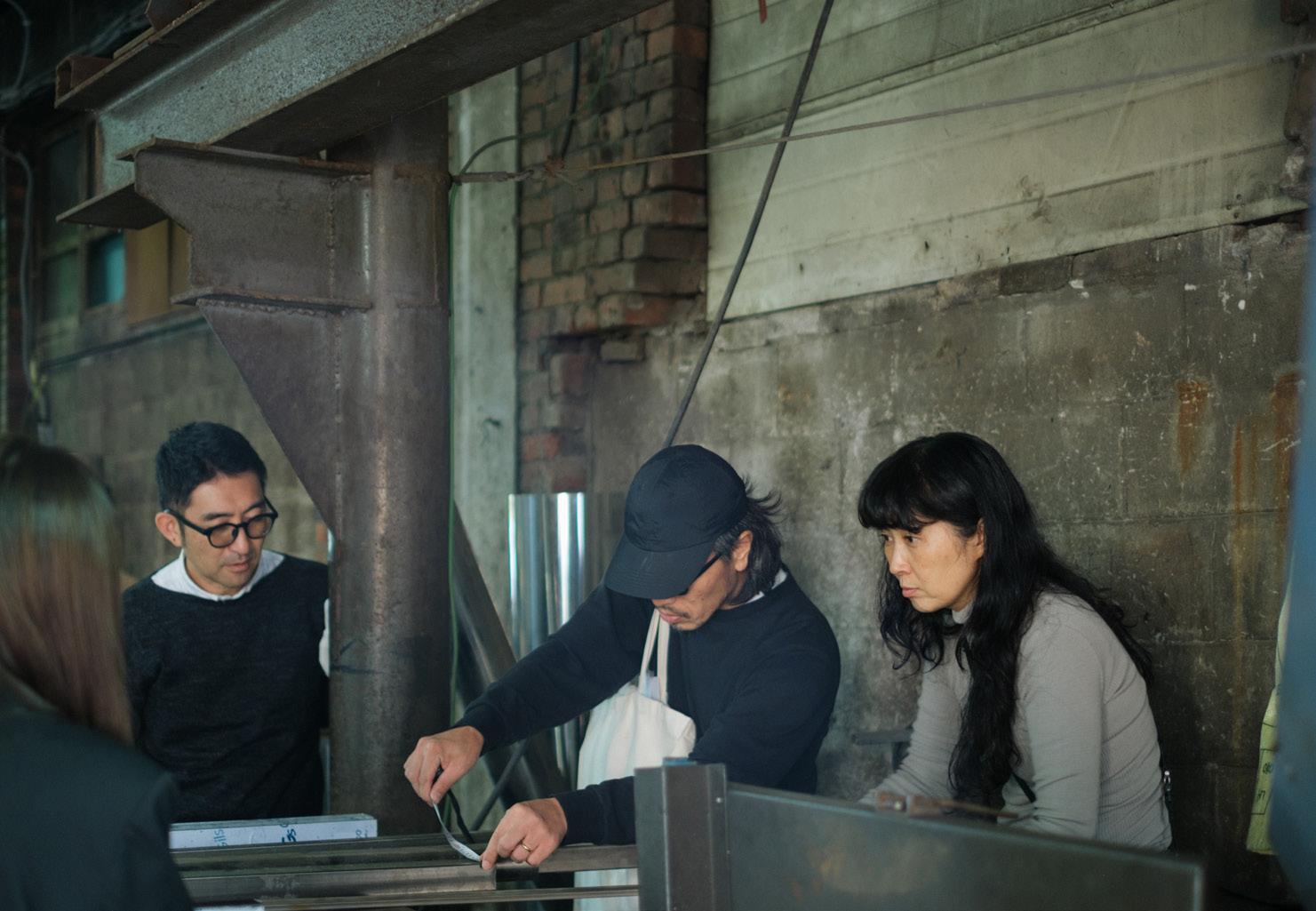 ソン・ジヘさんにお話を伺っている隣で、小倉さんがポケットからメジャ ーを取り出して、次々と不揃いな金属板のサイズを測り始めました。ステン レスの端材を THE HYUNDAI SEOUL のポップアップストアで使うことを 思いついたようです。切り出された部品もその端材も、同じステンレスの板 から加工されたもの。しかし、一方は製品として販売され、もう一方は産業 廃棄物として捨てられます。端材が廃棄物になるのか、あるいは素材とし て再利用されるのかは、それを手に取った人の考え方次第です。