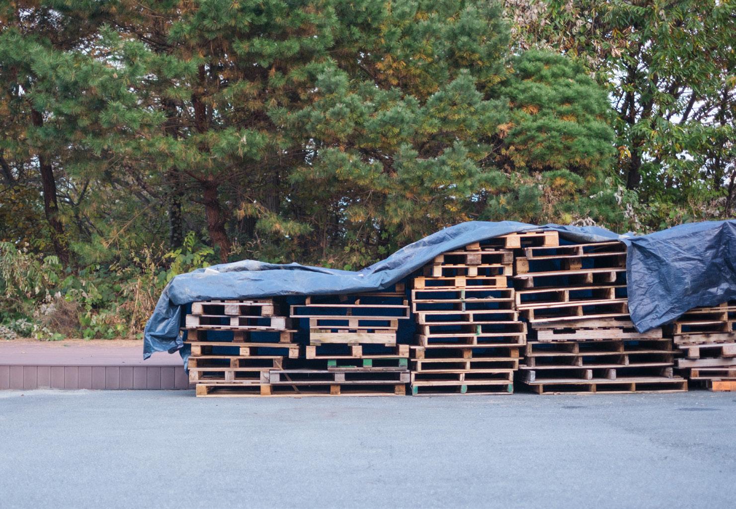 フィールドワークの終わり、ソウル市内に戻り、施工会社の DESIGN EYEON の作業場に立ち寄ると、運搬用の木製パレットが積み上げられ ていました。小倉さんが韓国有数の印刷団地である乙 ウルチロサムガ 支路 3 街を歩いて見 つけたもの。ウルチロサムガには、刷版工場、印刷工場、製本、型抜き、 製箱など、狭い路地に小さな工場が所狭しと並んでいます。紙や印刷物を 運搬するために繰り返し使用され、壊れて路上に積み上げられていた木製 のパレットを引き取り、これも THE HYUNDAI SEOUL のポップアップスト アで、什器として使用します。