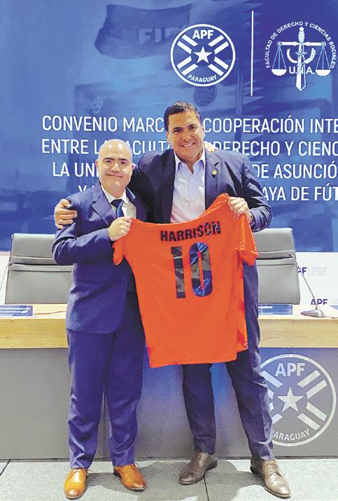 sionalización y la excelencia en la gestión del fútbol paraguayo. Trabajar de la mano con una institución académica de la talla de la Facultad de Derecho de la UNA nos permitirá fortalecer nuestras capacidades y asegurar el marco jurídico que rige el deporte”, expresó el presidente de la APF, Robert Harrison. Además del titular de la APF, participó del acto el secretario general, Luis Kanonnikoff , y en representación de la Facultad de Derecho de la UNA, el decano en ejercicio, Dr. Carlos González Morel.