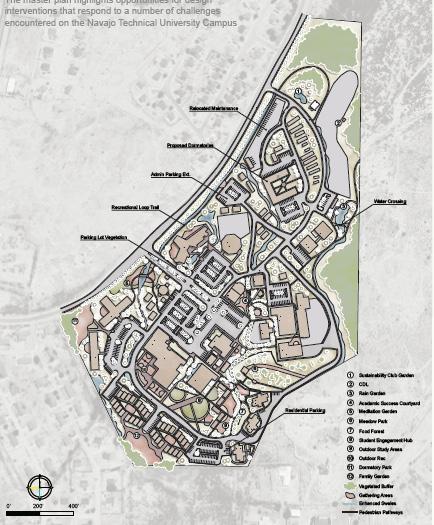 Working in partnership with Navajo Technical University (NTU), NTU’s student Sustainability Club, and an MLA studio from the University of New Mexico (UNM), students conducted a transformative and re-imagined vision for the NTU campus in Crownpoint, NM. The project addressed stormwater challenges and supported climate resilience while affirming Diné values through culturally informed green infrastructure and spatial or programmatic interventions that respect water as a central component in the socio environmental health of the campus and campus community. Particular attention will be given to healing the campus landscape through a reciprocal design process that engages NTU students, faculty, staff, and community members as co-creators.