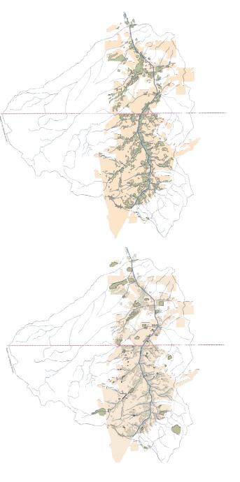 This map expands on the previous one by illustrating a broader network of suitable areas for GI development across Ambos Nogales