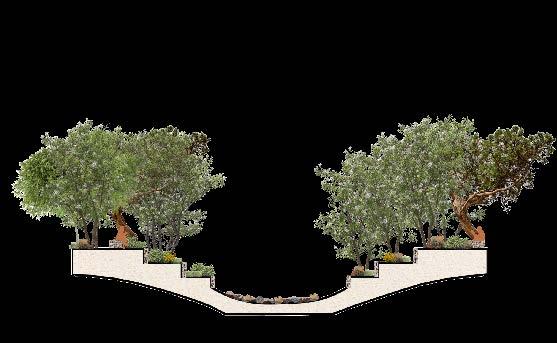 This section cut shows the terracing of the bioswale, designed to capture, infiltrate, and slow rainwater using green infrastructure techniques