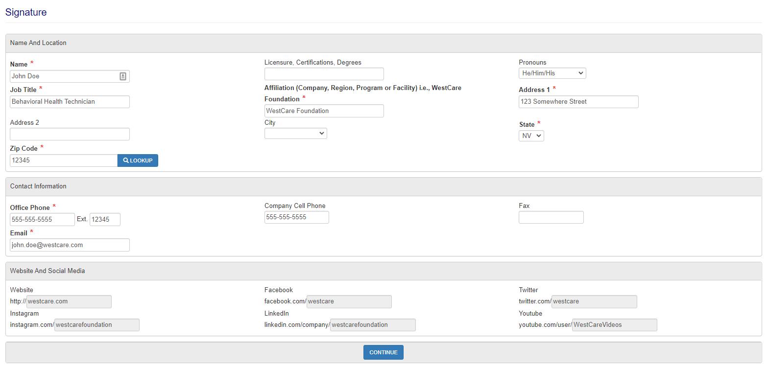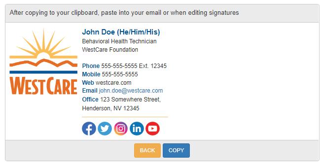 Using your WestCare-issued computer, visit our Intranet at https://secure.westcare.com and sign in with your credentials. In the left navigation menu, choose Signature Though some of your information will be pre-filled for you - you may update, add, or remove elements to your liking - including licensure, certifications, degrees, preferred pronouns, company name, cell phone number, and more. Most of this information is optional to include.
