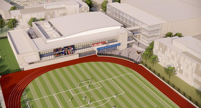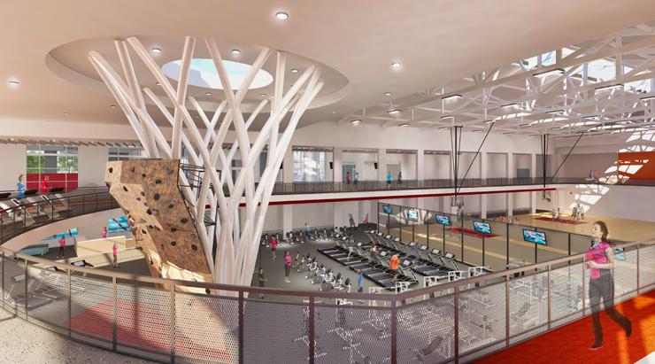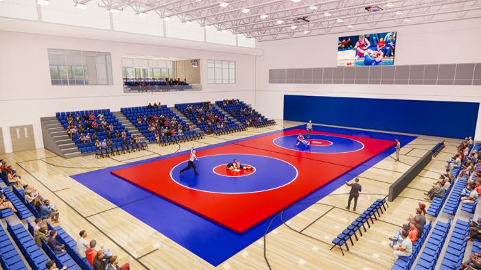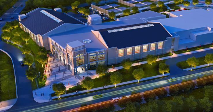 The facility features a main event space with seating for 3,100 people, a presidential suite, and a student health, wellness, and recreation area with a fitness mezzanine, group exercise rooms, student commons area, locker rooms, and support spaces. The facility’s flexible-use rooms will support students through formal and informal learning and collaboration.