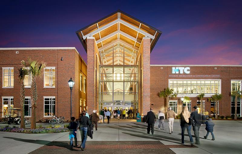 The HTC Student Recreation and Convocation Center serves as the primary focus of student life at Coastal Carolina University by combining three major program elements: a 3,500-seat multipurpose arena, a student recreation center, and the student bookstore. Key features within the facility include flexible arena seating designed to accommodate 3,300 or retract for up to 5,000 portable seats during special events. The 45,000 sf two-story recreation center contains an open atrium that is designed around a central climbing wall. Free weights, fitness equipment, and a three-lane fitness track area are all contained in an open, airy atmosphere while environmental graphics result in a unique sense of place. The 11,000 sf student book store has been designed as a food service, retail book and product destination with adjustable shelving, displays and lighting systems.