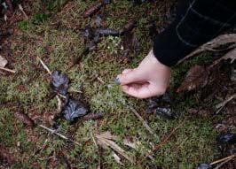この森を管理する北海道大学の小林真博士を先頭に、原生林の中を歩き ます。足元の土は耕したばかりの畑のようにフカフカです。寒さの厳しい 北方の森では、土の中の微生物が少なく、落ち葉などが分解されすぎるこ となく積み重なっていきます。こうしたフカフカの土は、木よりも多くの 炭素(二酸化炭素の材料になってしまうもの)を蓄えているそうです。そ んな話をしながら、ある場所で小林さんが立ち止まりました。