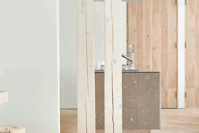 北海道長沼町に建てた一棟貸しの宿 MAISON SHIRO 。 SHIRO の製品が誕生するきっかけは、畑や海を訪れ、素 材に触れて、香りを嗅ぎ、口にして、生産者である農家 や漁師と出会って彼らの想いを聞くことから。そんなも のづくりと同じようにMAISON SHIROも、木こりの案内 で森を歩き、森の未来を考えて間伐される木々の中から 柱や壁に使う材を選び、どこへ使うか決めていきました。 規格外の野菜が不格好でも栄養があって美味しく食べら れるように、木材に節や割れがあっても、石材の大きさ や色が異なっていても立派に機能する。そしてそんな材 こそ唯一無二の個性と美しさがあるのです。