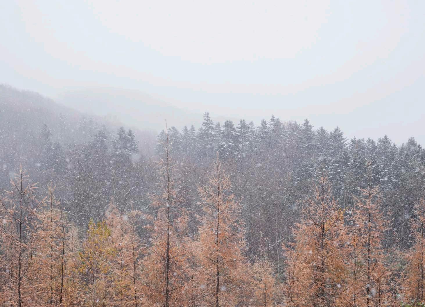 PAPER 編集部は、取材のために車を走らせました。鮮やかな赤や黄色に 紅葉した森には白い雪が降り積もり、昨日までとは全く異なる景色が広が ります。これだけ広大な風景を一夜にして変えるのが自然の力。人間には 不可能です。秋から冬へと移り変わるこの時期だけの自然の美しさを堪能 しながら向かったのは、北海道砂川市の山間エリア。