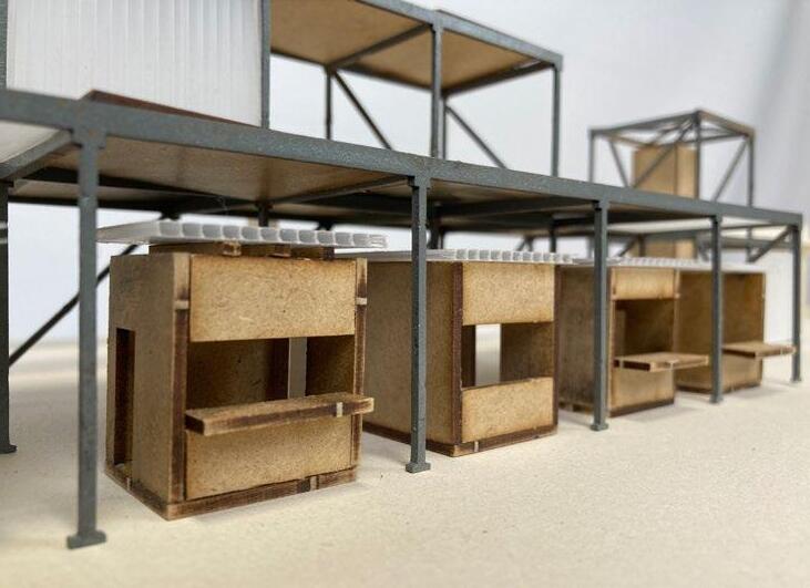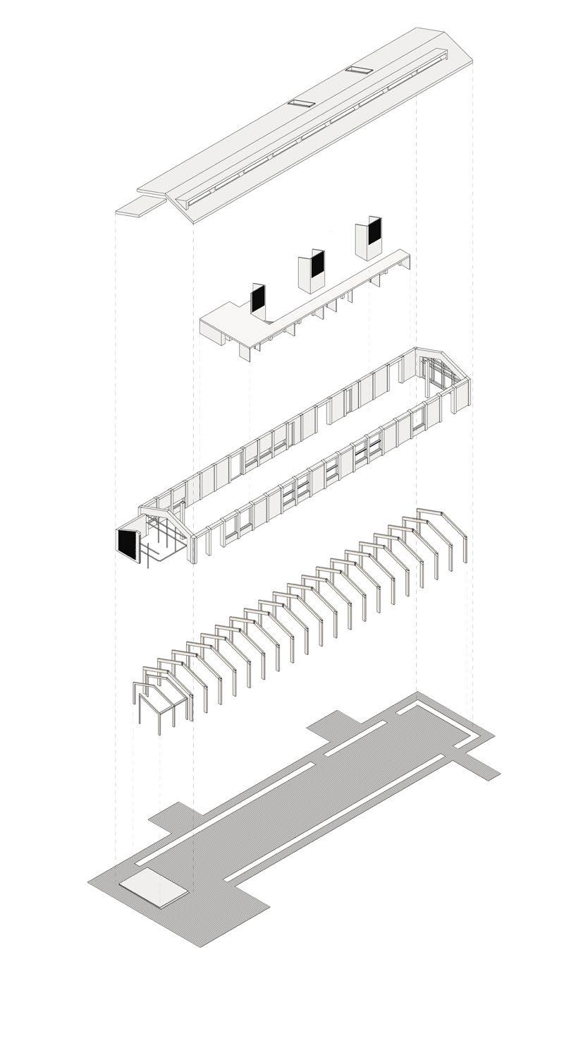 The wooden boxes create a dialogue between materials, connecting the raw, industrial character of the steel structure with a more human scale and tactility. Their mobility and diversity highlight the project’s ambition to be dynamic and functionally adaptive